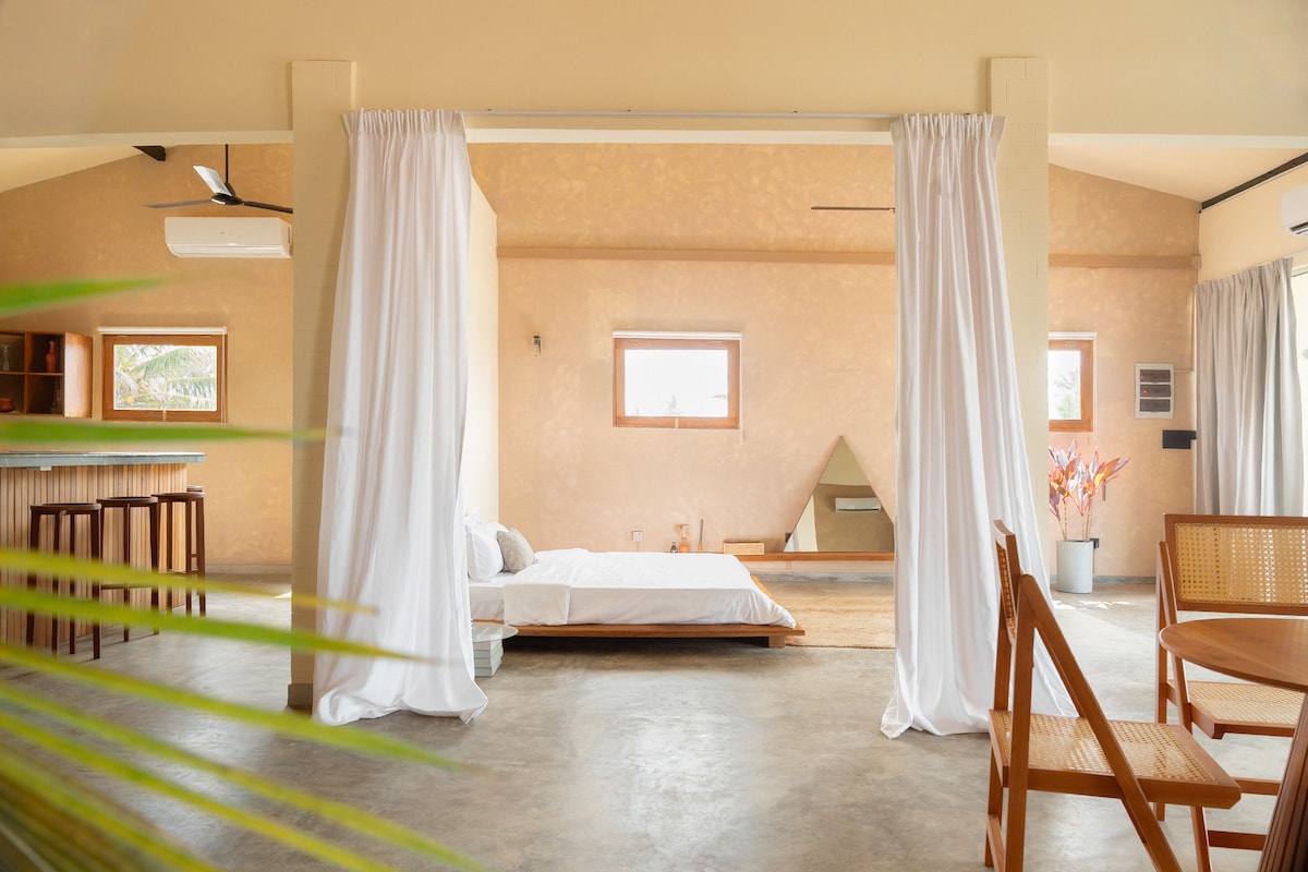 The surf loft is the only apartment in a 2 storey building. There is full privacy with only one entrance. It is located in the heart of the Kabalana surf scene. The loft blends coastal charm with creative energy and urban industrial vibes. Bright colours, eclectic art and open spaces capture the spirit of a beachy surf loft. This very unique space has a semi equipped kitchenette, bar, indoor hot water shower, lounge & dining area and balcony. It is part of the Licuala brand of hideaway homes.