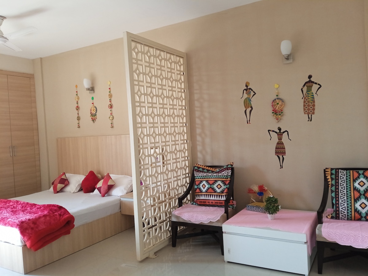 Welcome to Boho Bliss Studio by Shrisaa Homes, a charming and colorful hideaway in the heart of Vrindavan. Designed with a mix of modern comfort and boho charm, this studio apartment offers the perfect space for couples, solo travelers, or small families who want a cozy and stylish stay while being close to the city’s most sacred temples.