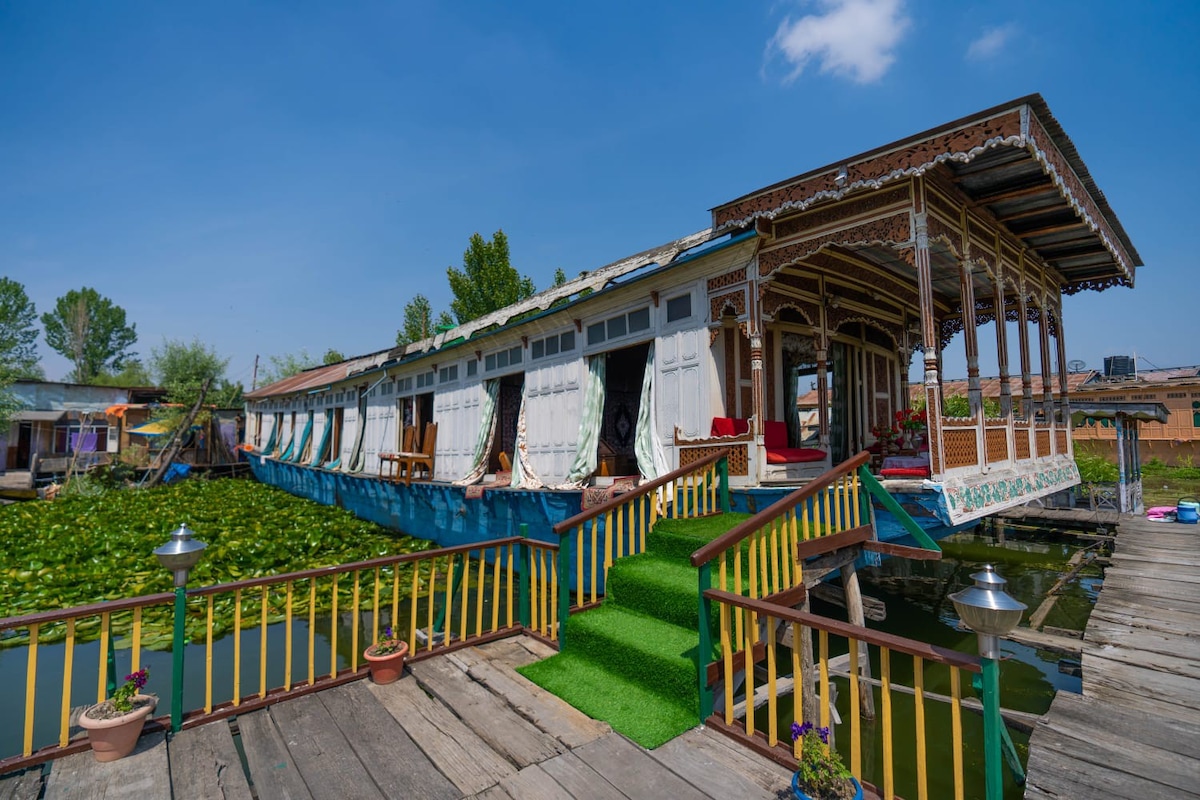 Traditional houseboat located on Dal Lake facing the Zabarvan Mountains in a peaceful area. We have been happily serving our guests from all over the world for 90+ years. Enjoy a scenic view of lotus farms and water lilies with sights of migratory birds. Houseboat is divinely decorated with traditional Kashmiri furniture and upholstery. Perfect for a relaxing gateway. Our houseboat includes unlimited high-speed WiFi and comfortable seating areas ideal for WFH.