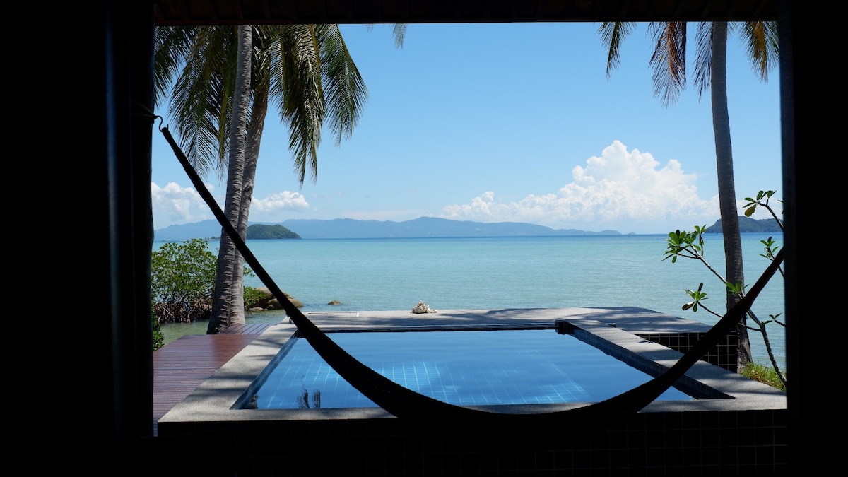 A well equipped private pool villa directly on the beach, This Adults only villa is located on the west coast of Koh Phangan on Hin Kong Beach. Some of the islands best restaurant's are all within walking distance. The villa has stunning views of the National Marine Park, a private beachfront area with plunge pool, a hammock, a romantic day bed and beach loungers. Truly super clean & comfortable accommodation. Beautiful sunsets can be viewed direct from your bed, balcony or hammock.