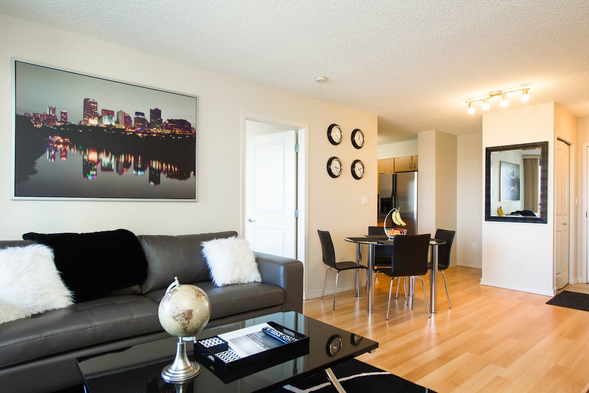 Check out your stylish and spacious AirBnB in downtown Edmonton. Welcome to a five star AirBnB equipped with everything that you need for a comfortable stay close to all that downtown Edmonton has to offer with expansive views of the Edmonton River Valley. * Please note, our pool is currently closed. *