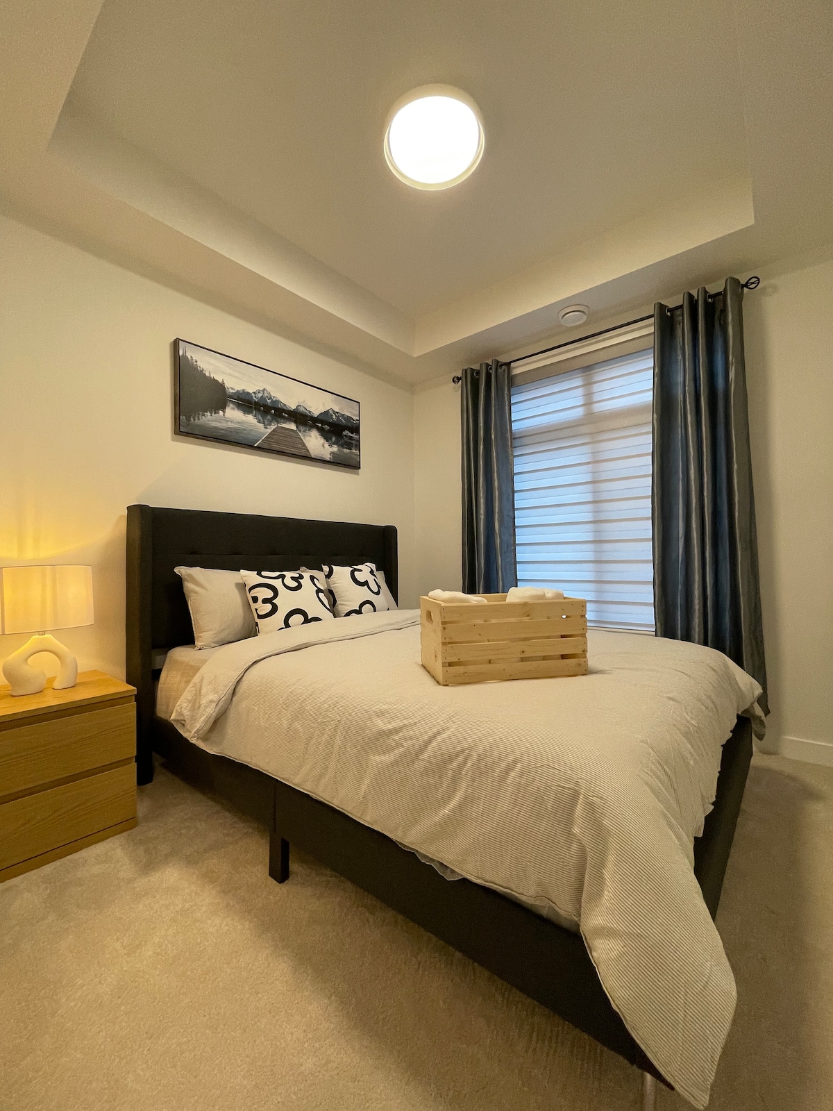Please note that this is an adult-only unit. Newly finished and professionally staged 2-bedroom luxury condo in Windermere. Accommodates up to 7 guests. Heated underground parking; minutes from The Currents shopping-entertainment complex. ★ Professionally cleaned and managed ★ Underground heated parking ★ Minutes away from shopping, restaurants, and entertainment ★ Easy access to airport and arterial roads. ★ Fully stocked kitchen ★ Good-sized office providing added flexibility