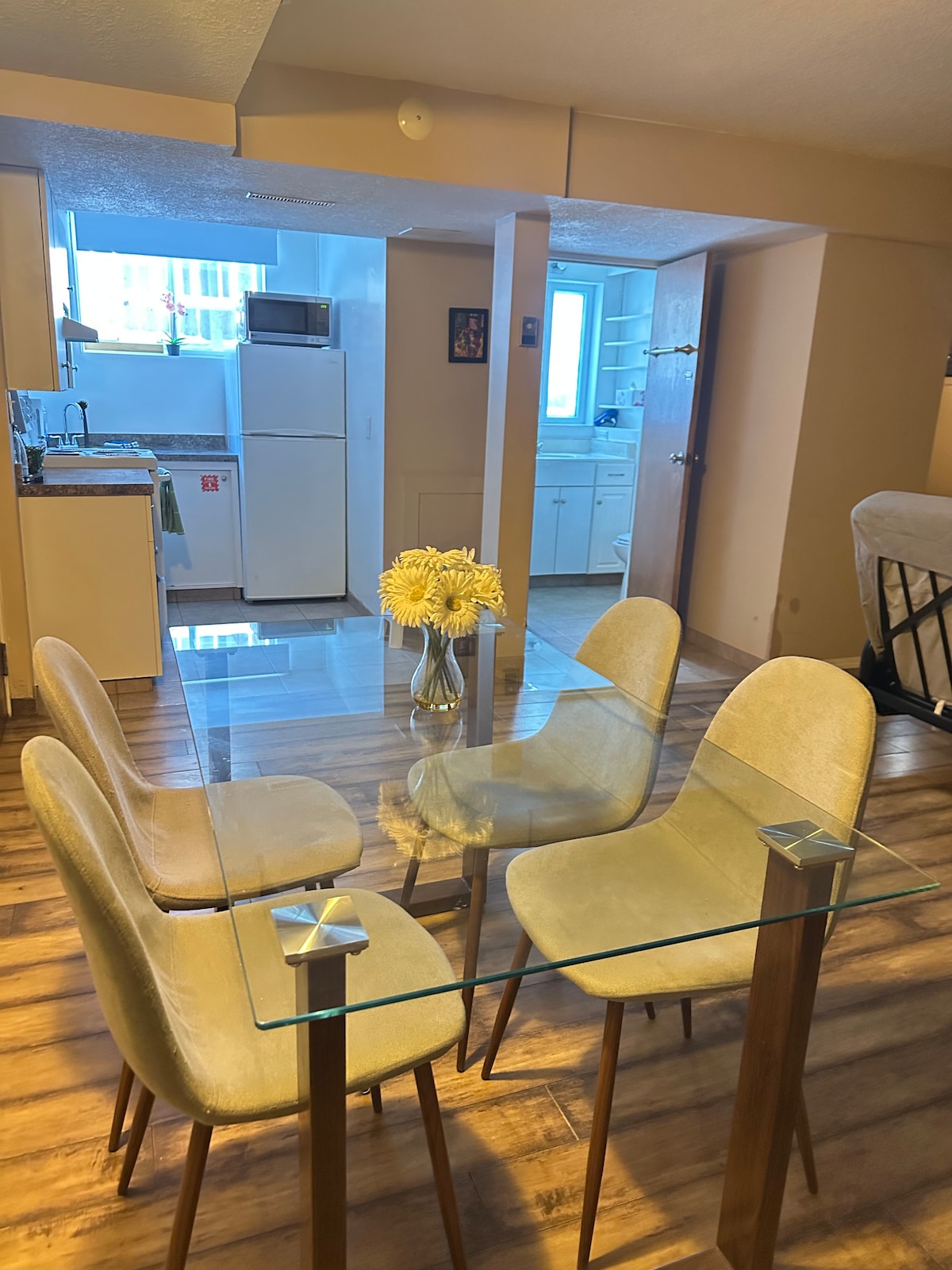 Private basement suite with 8' ceilings and lots of natural light! Your own entrance leads to secluded suite full of all the amenities you will need during your stay. A small patio area means you can enjoy your morning coffee in the sun! Luxury bedding, 55' HD TV inclusive of Netflix, Prime and Disney+ to enjoy while you relax! Located in downtown Edmonton, the community has a private lake, apple orchard and playpark. Free parking on side street steps from the suite. Pets welcome!