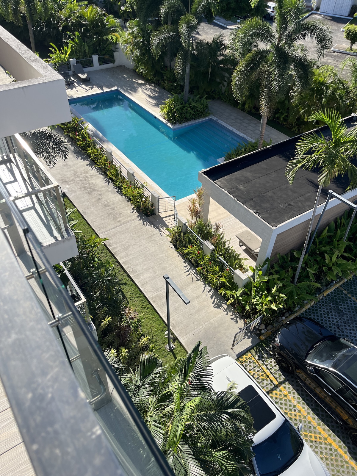 Luxury condominium in the heart of Kingston. Centrally located and five minutes away from the Half Way Tree and New Kingston commercial hubs. The apartment is in a gated complex with 24 hour security. There is WiFi, and a balcony overlooking the pool, street view, available parking and AC throughout. Access to the washer and dryer is available ONLY to guests staying a minimum of 7 nights.