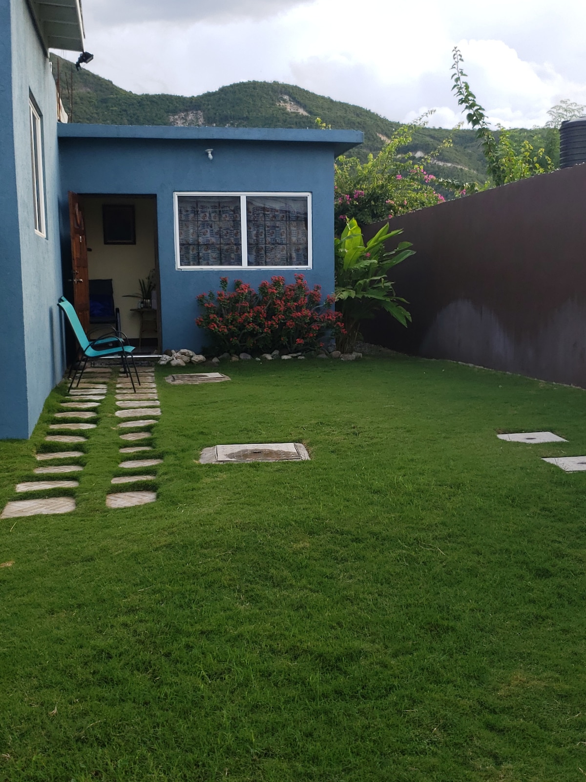 Gated community about 12 meters off the beach. The waves will not roll over your feet as you step through the door. You are able to hear the peaceful rolling of the waves from your room. There is a large lawn at your door with a pair of chairs for relaxation. Guests have also picnicked and sun bathe here. Self contained room with kitchenette and hot tub. Air conditioning available. The property is 12 mins from airport in Kingston. Pick up from airport is available at an extra cost of $25