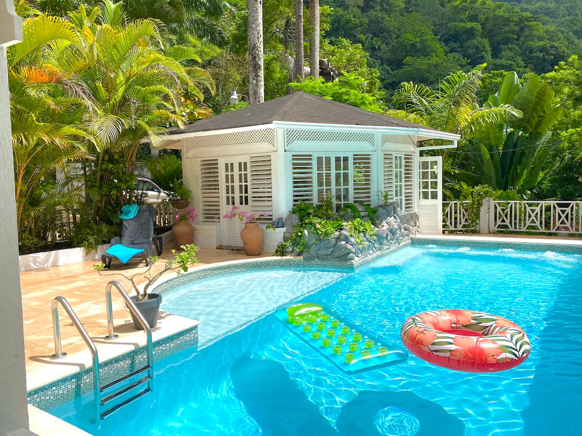 This stylish place to stay is perfect for a family getaway..or just for two, whether you're celebrating a special occasion or just a well needed break. The location is unbeatable! Only minutes up the hill from Kingston you'll have a stunning view of the city. Take a dip or do laps in the refreshing pool nestled between the palm trees in the private court. Large luxurious bedrooms and bathrooms; separate living and family rooms for everyone to spread out and relax. Book your stay today. Enjoy!