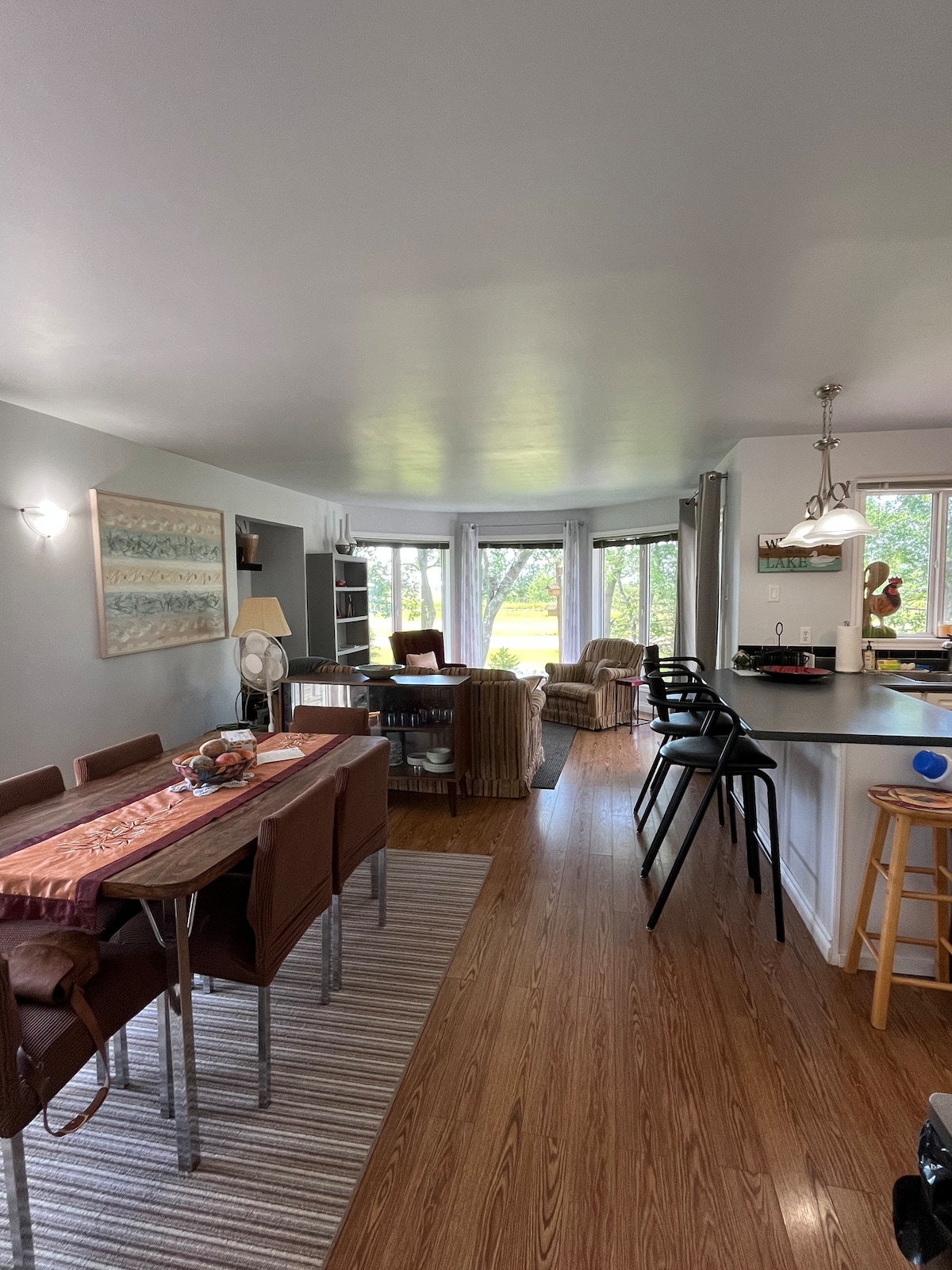 Four season waterfront home situated on a one acre property with 300’ of water frontage. 1400’sq home is nicely furnished and well equipped. 3 large deck areas and 60 feet of dock with boat launch access. Gas BBQ, large fire pit area. 2 fully serviced RV sites are also available. Enjoy swimming, boating, kayaking, paddle boarding, fishing etc. World-class golf course, restaurants, grocery/gas just minutes away. Hosts live nearby for your convenience. 7 day rentals only during peak season.