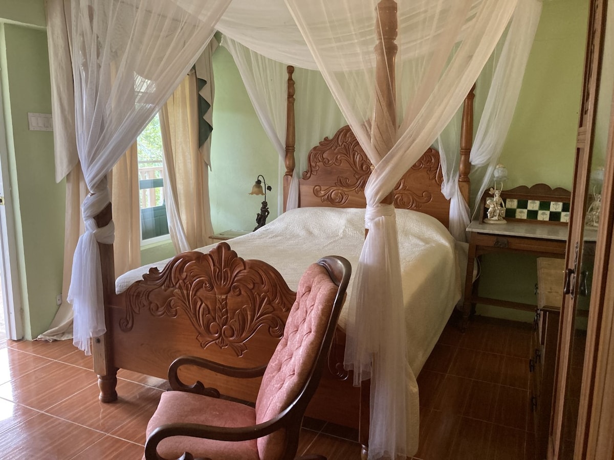 A lovely bedroom with a double four-poster bed with mosquito netting and a cot bed. The room is stylishly furnished with antiques and decorated beautifully with an en-suite bathroom comprising of a private sink, shower and toilet. The bedroom is located within the incredible Geddes Great House Estate. **PLEASE NOTE THERE ARE OTHER ROOMS AVAILABLE ON THE ESTATE. THESE CAN BE FOUND BY FOLLOWING THE "HOSTED BY SARAH-VICTORIA" SECTION***