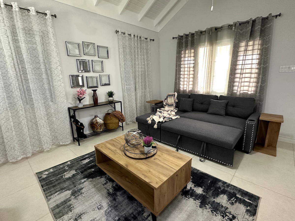 Welcome to your perfect getaway in Drax Hall, St. Ann! Contemporary 1-bedroom villa with a Queen Bed offers comfort and convenience, ideal for remote workers, couples, or solo travelers. Relax in the spacious living room, cook in the fully equipped kitchen, and enjoy the furnished front porch. Stay productive with our office space, high-speed internet, and natural light. Just a 3-minute drive to the beach and local restaurants, you'll have the best of St. Ann nearby. We can’t wait to host you!