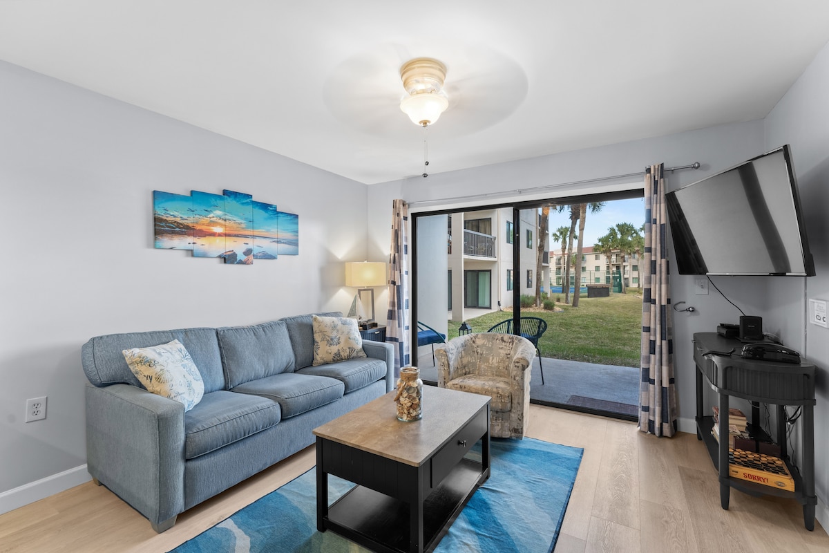Our little slice of paradise is situated in the heart of St. Augustine Beach right on A1A Beach Blvd. Our unit, recently renovated, is just steps from the beach and closest building to the pool! 2 outdoor pools (1 heated in winter), 5 hot tubs & tennis courts. Perfect location to enjoy our beautiful beaches & all that Anastasia Island has to offer! Historic St. Augustine is less than 7 miles away. Unit is equipped with everything you need for a perfect beach vacation!