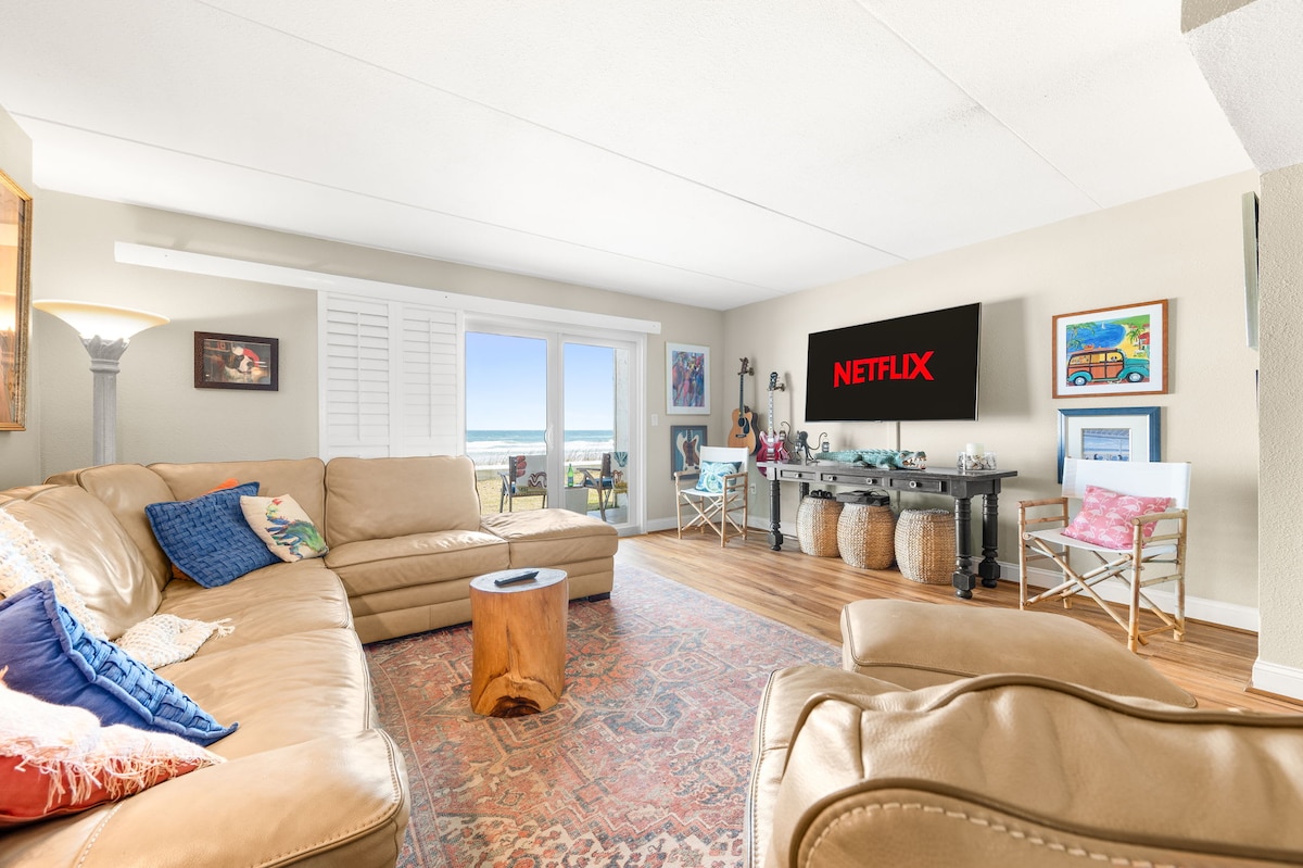 Top floor, direct ocean front, 2 bedroom, 2 bathroom corner unit condo with elevator and unobstructed beach views from both bedrooms, living room, dining room, kitchen and private balcony in beautiful St Augustine Ocean and Racquet Resort. We also offer the condo immediately next door for rent, Ocean Front Escape: https://www.airbnb.com/h/saint-augustine-oceanfrontescape. Our checkin process is contact free. We use a Nest lock on the front door.
