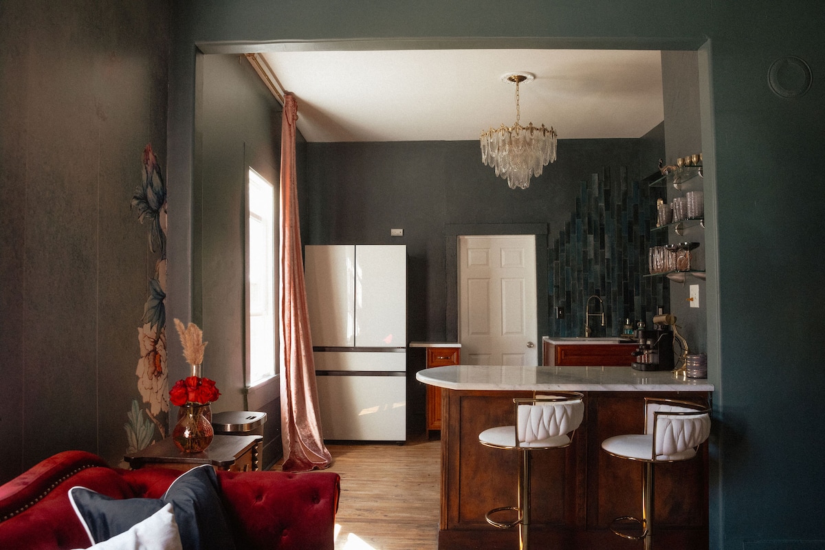 A real Bed & Breakfast historic 130 plus year old home (so set expectations accordingly), private room with 2 queen bedrooms ensuite full bathroom. A glass tiled small shower, jetted tub, tile and hardwood floors, individual A/C heat with remote control, electric fireplace, television, and tons of privacy in this non smoking oasis. This suite is located on the 2nd floor(no elevator). One onsite parking spot, and full 2 course breakfast is included! Service is what sets us apart.