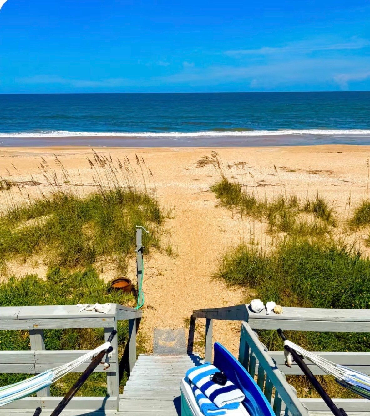 High Tide is the upper unit in my Triplex in St.Augustine Beach - SAGE TIDES - on the East side of A1A Beach Blvd (i.e. no street to cross!). Two large bedrooms with a new KING bed and a Queen and a rollaway. Walking distance to everything - bring your flip flops - stay awhile! On a dead end road, two houses from the beach make it a 90sec walk to the sand dunes and ocean! Two decks to catch the breezes, morning & night! The decks are only accessible by your unit. Bonus - Pet friendly!