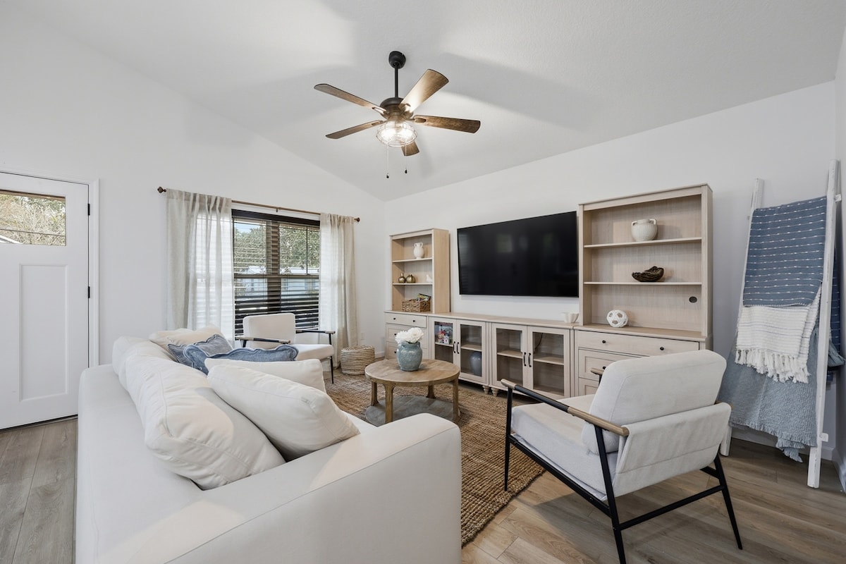 Casita Luxe Retreat Near Historic St. Augustine – Pet-Friendly Haven! Discover this luxurious 3-bedroom, 2-bath retreat! Designed with a modern luxe aesthetic, it features custom wood paneling, a fully equipped kitchen with a chic island, and a king-size plush mattress. Enjoy the large, fenced yard, fire pit, outdoor shower, and fun family games. Pet-friendly, with Wi-Fi, smart TVs, and parking included this home offers comfort and style in an up-and-coming neighborhood. Book now!