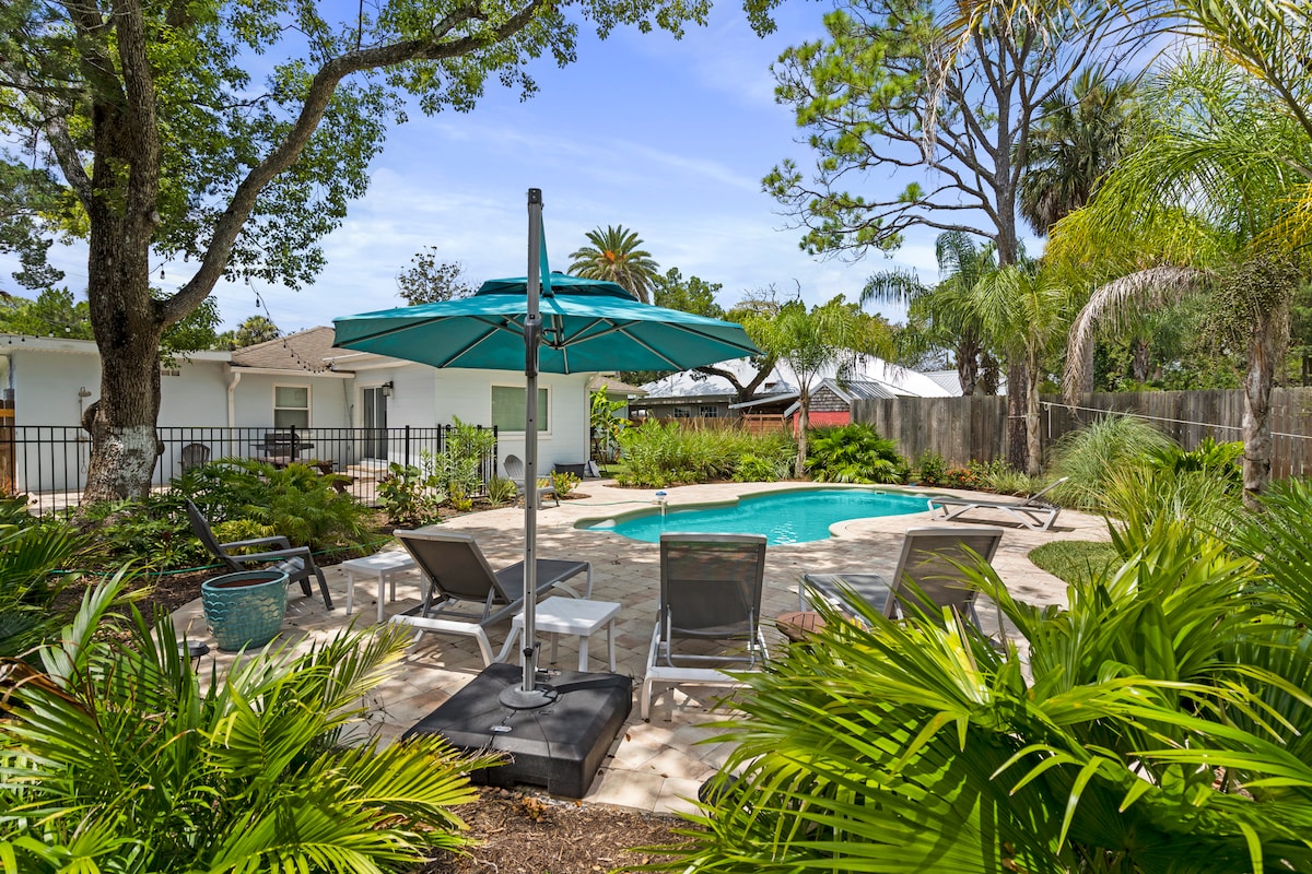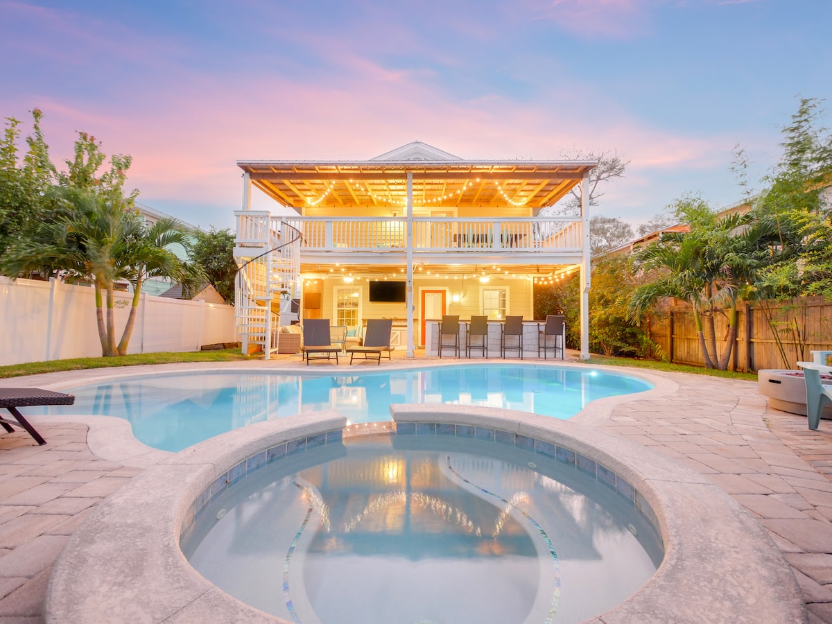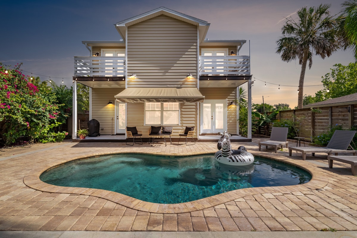* Built in 2023- luxe coastal furnishings & linens * Featured in 2024 Good Housekeeping Mag🌟 * 2 King Suites (1 on each floor) | 2 Queen Bedrooms | 3.5 Baths * Private Saltwater Pool & Spa/Hot Tub * Poolside Cabana | Outdoor Kitchen | Front Porch * Bikes, Beach Toys, Beach Chairs * Lush Tropical Landscaping * 0.2 miles - gorgeous quiet beach * 5.5 miles- historic downtown St Augustine- The oldest city in the United States! * 0.2 miles - Cap's Restaurant for sunset dinner on the water