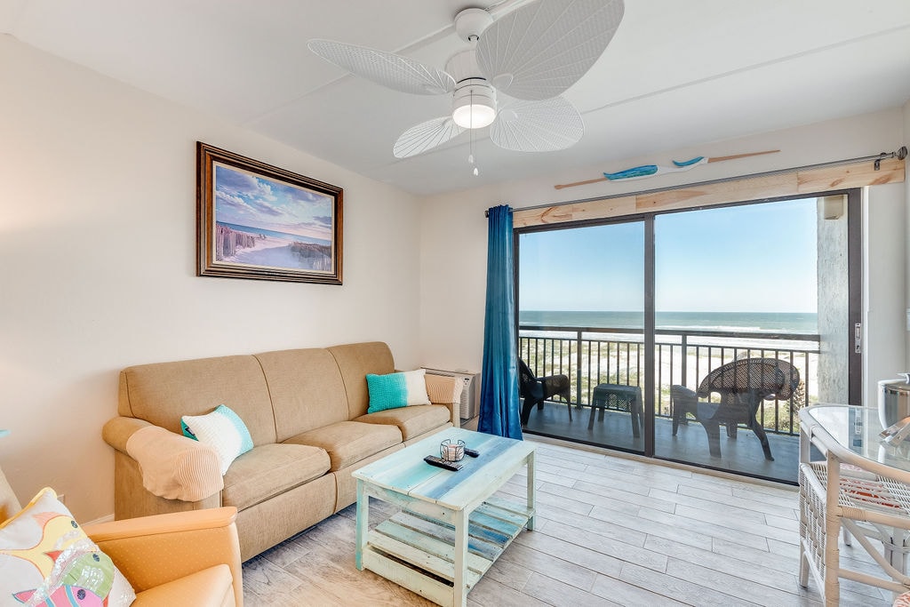 Skipper’s Hideaway is a charming beachside retreat that sleeps up to six, with a king bed, queen sofa pull-out, and twin daybed with trundle. Located on the ground floor for easy access, the condo offers a partial Atlantic Ocean view from the living room window. Just steps from Crescent Beach, this peaceful spot is perfect for relaxing. For more excitement, the shops, restaurants, and nightlife of downtown St. Augustine are only a 15-minute drive away.