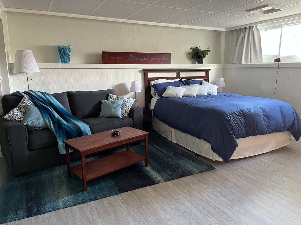 Private cozy suite with a private bathroom. Suite includes 1 bedroom (1 double bed), 1 bathroom, living room with large screen TV, sectional couch (turns into double bed), kitchenette includes: countertop with sink, fridge, table & chairs, toaster oven, coffee maker, Kettle and microwave, toaster, dishes and cooking essentials. It is located in the basement of a character home with lots of mature trees with restaurants nearby and is in one of the most desirable neighbourhoods in Winnipeg.