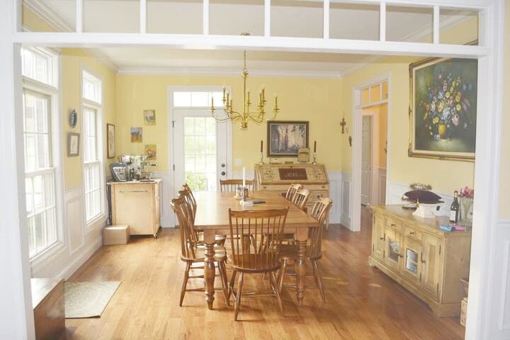 We offer a gorgeously decorated mansion in the middle of a private, rural setting. There are many opportunities for a one-of-a-kind experience with wooded trails, Peace Garden, .4-acre stocked fishing lake, campfire rings, puzzles and games, ping pong, and more. We take breakfast seriously with what might be the world's best coffee, an enormous selection of teas, various Keurig cups, and a hearty, delicious meal that may include Billion Dollar Bacon to start your day & get you on your way.