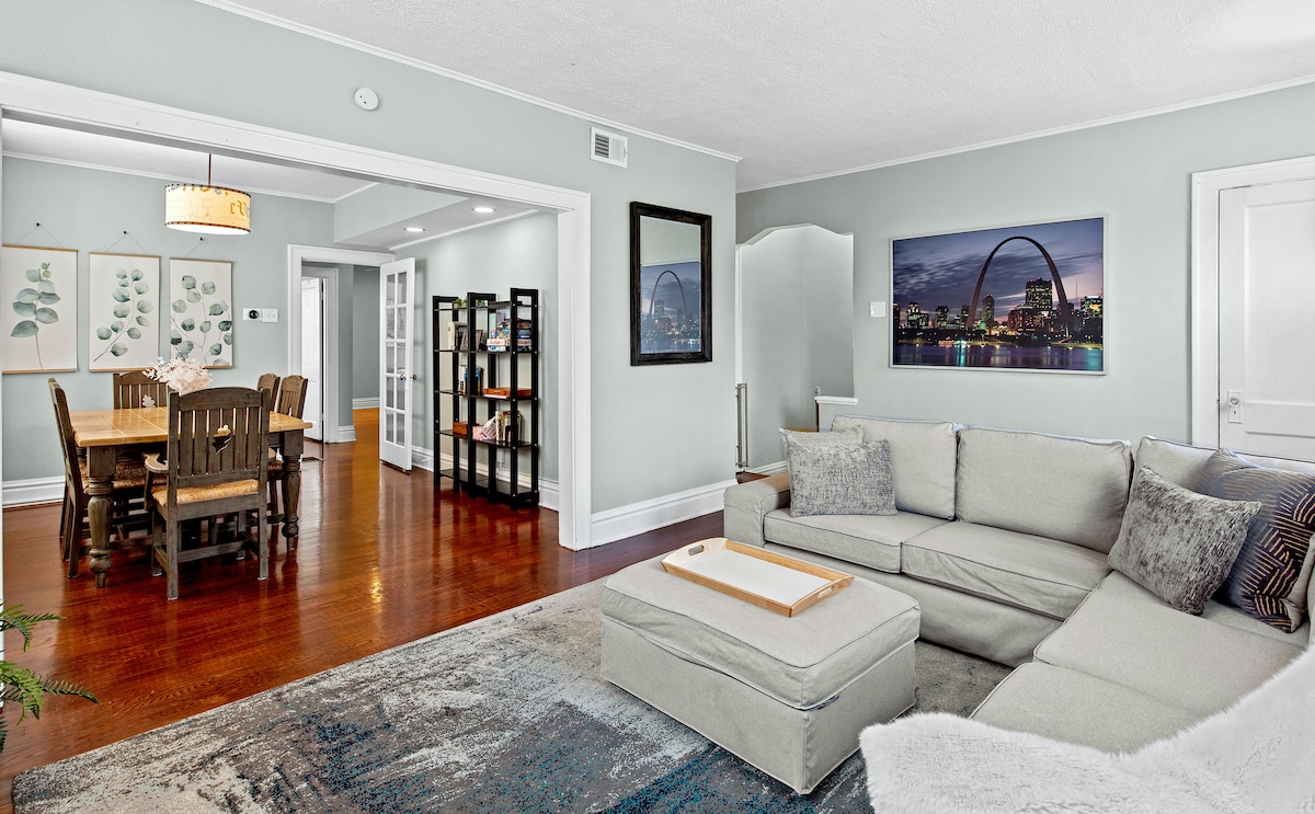 You'll love our newly renovated 3 bed/1 bath 1st FLR luxury apartment w/High Speed Fiber Internet. Centrally located to all St. Louis attractions. Just a block from the Botanical Gardens & a few minutes to Hwy 44, Tower Grove Park, IKEA, The Hill, The Grove, Forest Park, SLU and more. The space includes 2 queen beds, 1 Double, 1 trundle & additional air mattress. Families, singles, couples & business travelers will all enjoy this gorgeous space, large playground and sand pit in the back.