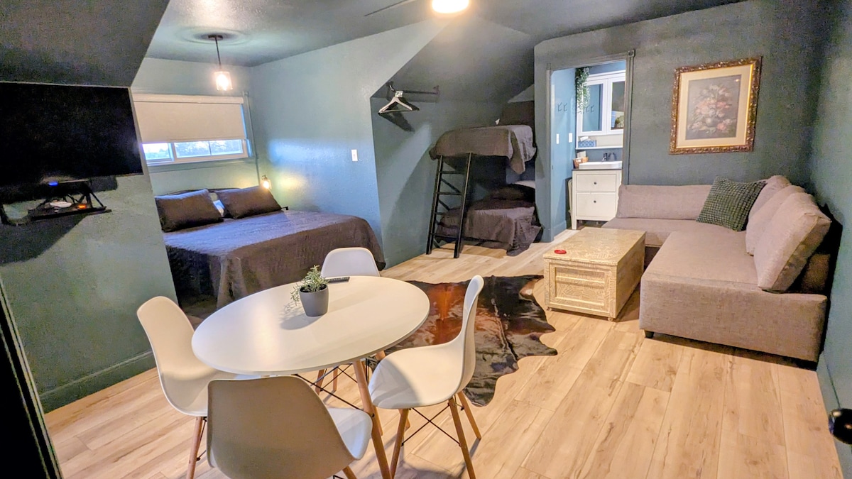 Kick back and relax in this calm, quaint, stylish space. Loloi rug invites you in and Roku TV wants you to stay a while! It’s also centrally located right off 54 Hwy in El Dorado Springs. With a new flat screen smart TV and an electric fireplace, cozy bedding and a Bamboo pillow top mattress, you’ll love this space! Secured personal entry and private bathroom with all the essentials. Fridge, microwave, toaster, Coffee pot, and even wine glasses to complete your stay. Don’t miss out. Book now!