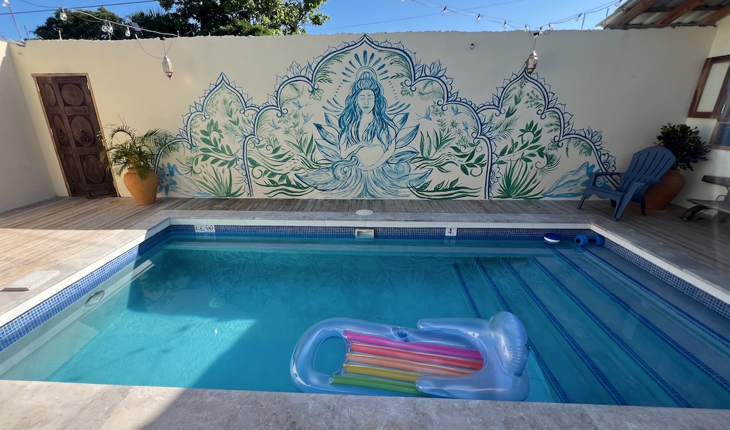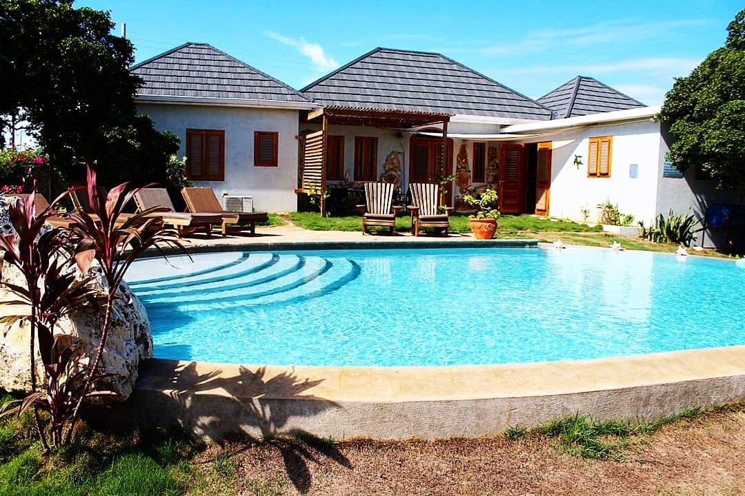 A charming villa located in a sought after location in Treasure Beach. It has an eco vibe and is surrounded by lush tropical landscaping with a private pool area at the back and a large veranda at the front. It is in a quiet area, but within easy walking or biking distance to local shops, restaurants and amenities. The beach is located right across the road, with the entrance less than a two minute walk away. It has good internet and is a perfect place for extended stays and remote working.