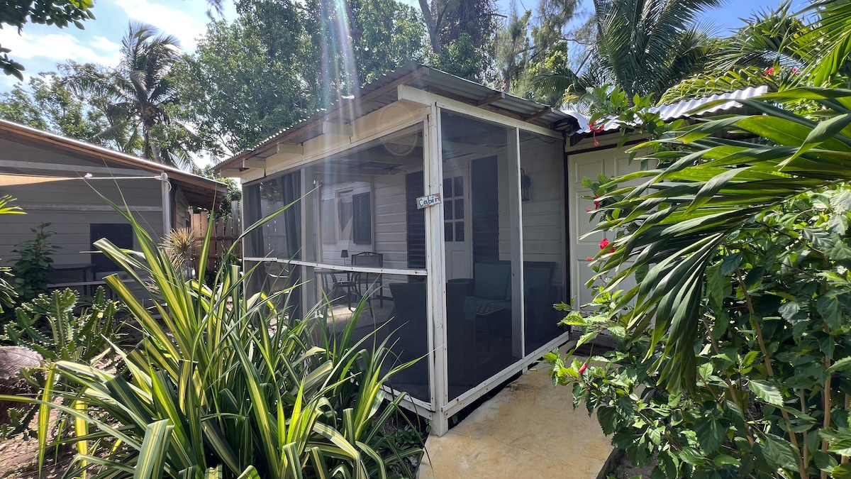 This cabin is a single level beach home nestled in tropical gardens. Enter through the screened in hammock porch, to a plush queen size bed, hanging bar closet and AC cooling with the kitchenette and bathroom en suite. The adjacent den works perfectly as a chill spot. It is fan cooled only. The kitchenette is equipped with a refrigerator with freezer, sink, dishes, cutlery, electric kettle and coffee mugs.