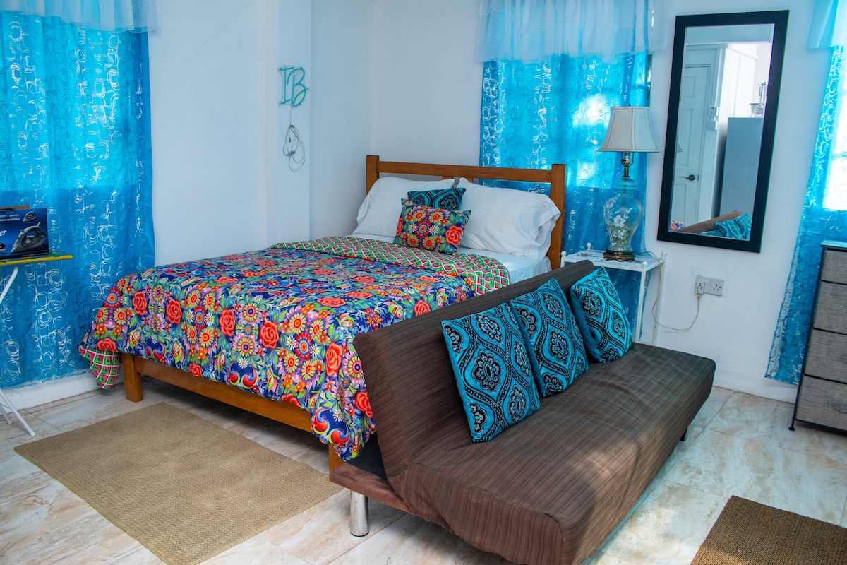 Enjoy a 1-bedroom apartment with a full kitchen, plus a private bedroom with its own bathroom—perfect for families or small groups. Both spaces are air-conditioned and feature their own TVs for added comfort. Located in a serene neighborhood with lush gardens and tropical fruit trees, it’s less than a 10 minutes drive to Arnos Vale and Kingstown, and a 5-minute walk to a black sand beach. Ideal for relaxation, with easy access to nearby attractions.