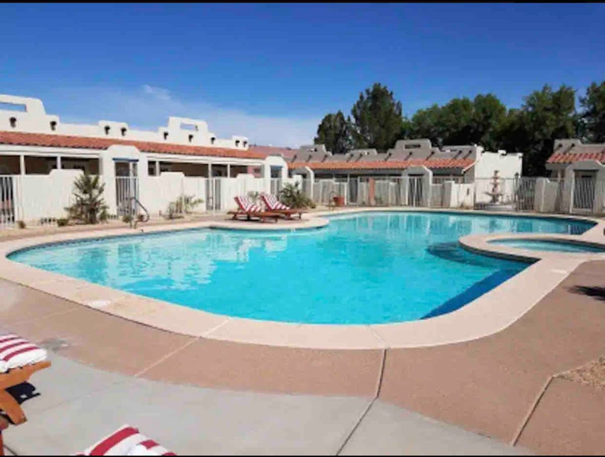 Park your bike in your private courtyard, slip into a marble jetted tub or personal hot tub, followed by your partner giving you a massage on your own private table. Or whip up a fantastic feast in the fully-equipped kitchen. Active days will end in the perfect night's sleep, tucked between hotel quality linens and a dreamy mattress. World class mountain biking, hiking, pickle ball, two pools are right outside your door. Need to work? 1400 sq ft separate two desk zones with great WiFi!