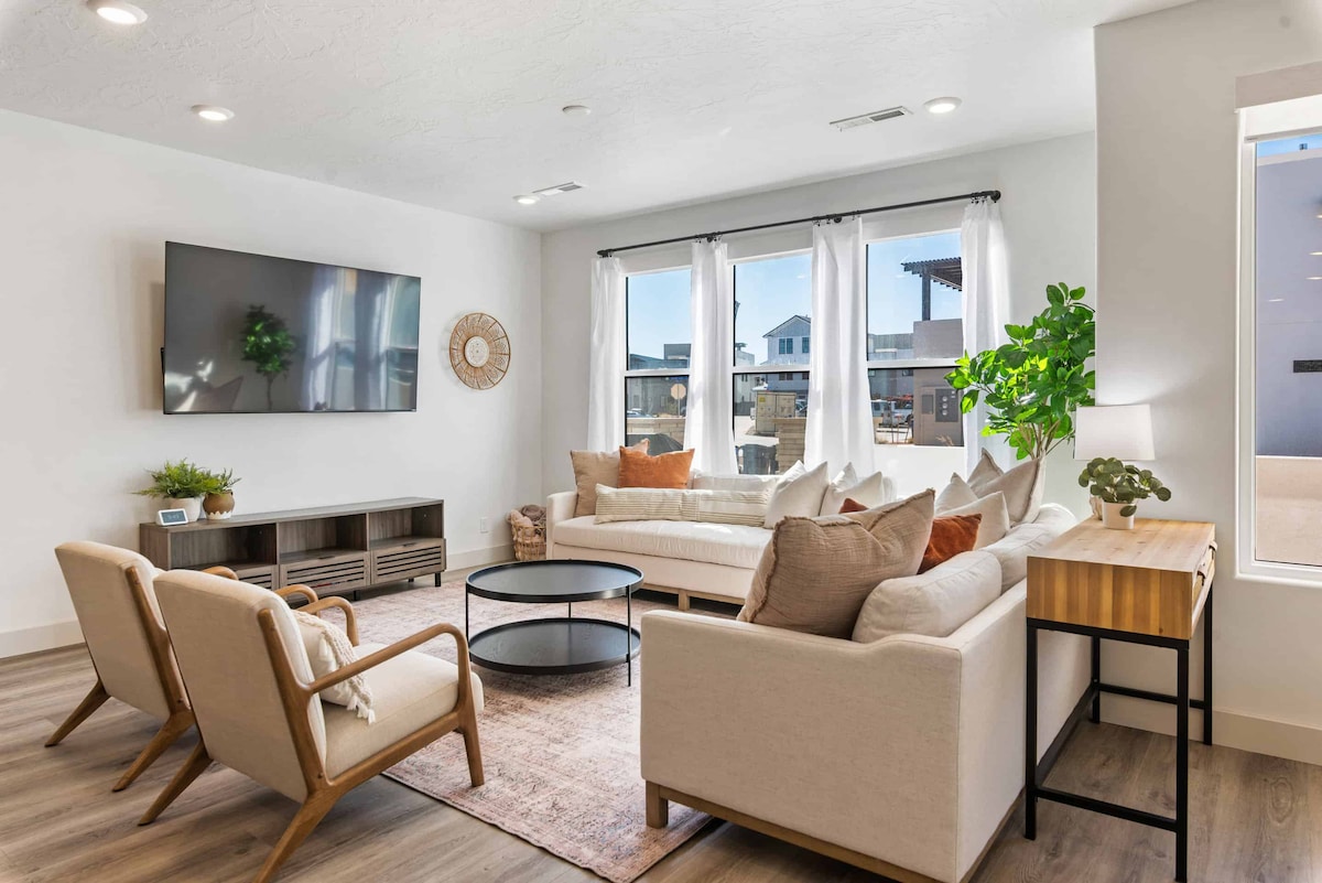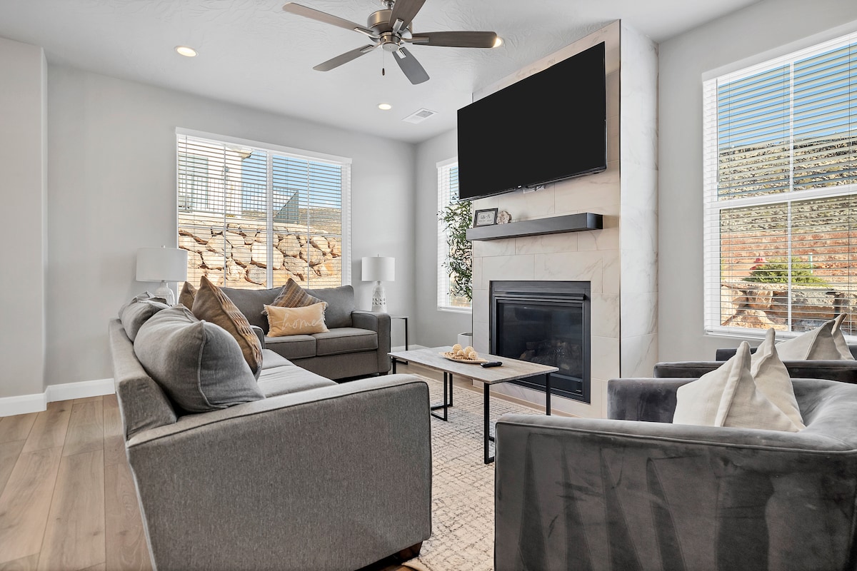 Brand New townhome is located 36 miles to Zion's National Park, and features a private outdoor hot tub, fire pit, and a heated pool! The quiet Vida Sol community is located only 2 minutes off of I-15 and 5 minutes to the St George outlet stores and Walmart/Costco. Mountain biking, walking trails and two parks nearby. ✓Private hot tub 🏊Heated Pool (Shared, heated year-round) 🛏️3BR/3BA 🛋️2 Living Rooms 👨🍳 Chef's kitchen 📶Fast/Free internet 📺Smart TV's ❄️AC 🔥Fire pit 🍖Grill 🛀Big bathtub
