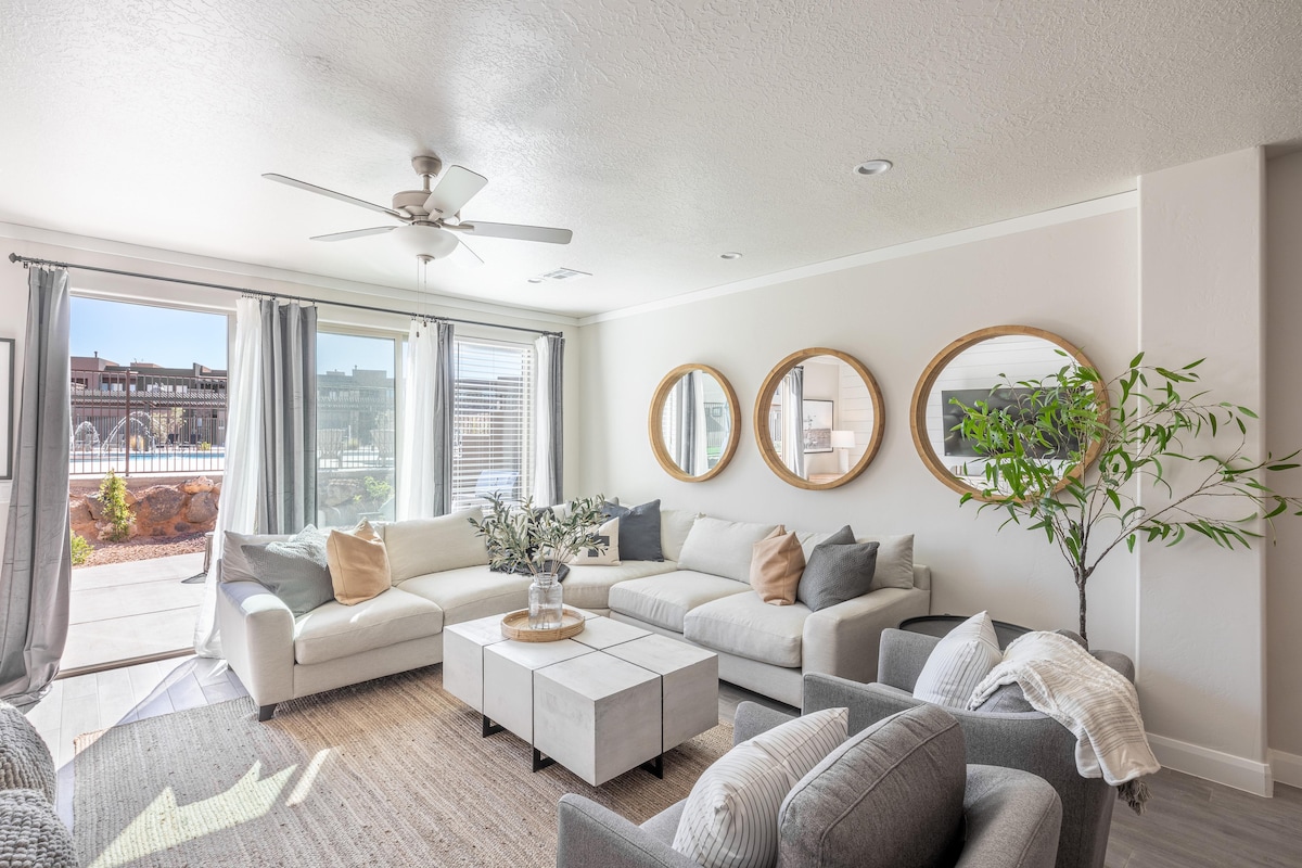 2-story home with private patio, grill, washer/dryer, outdoor pool, hot tub, AC Located two and a half miles from the heart of Washington, Utah, this captivating, two-story home is nothing but the perfect vacation abode for your family and friends! Spend entertaining evenings grilling on your private patio while your friends talk and share memories on the inviting outdoor sofa. Upon entering this air-conditioned home, a chic open floor plan will greet you. Curl up on the sectional and stream