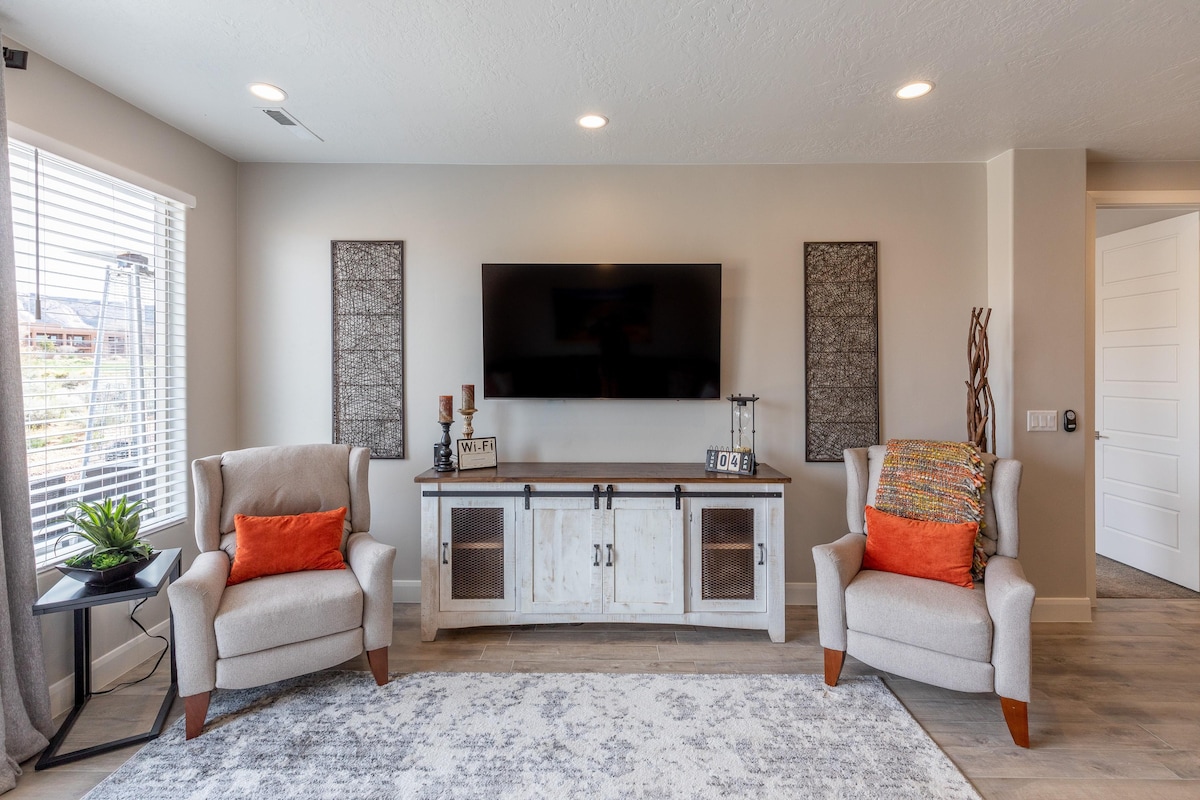 Relax at this quiet resort with heated pool and hot tub year round! This stylish villa features High-Speed WiFi, Private Entrance, King Bed, Large Dual Bathroom with Jetted Tub, Full Kitchen, Roku TVs, and Fenced Patio with BBQ Grill. Resort includes TWO Pools (Adult & Family), Hot Tub, Pickle Ball Courts, Tennis Courts, Fitness Center, Laundry Room, Ice Machine, and Spa. Best kept secret in St George with everything you would want for your getaway! Book Today at Discounted Rates!