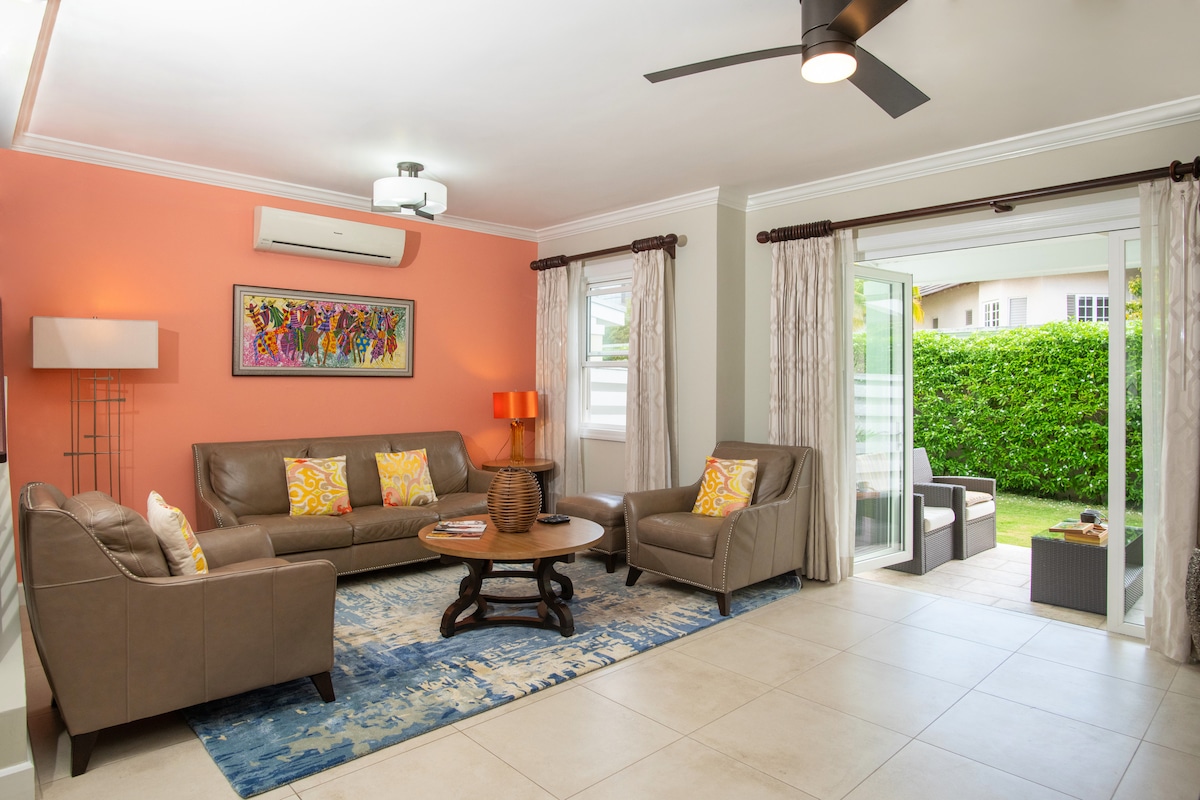 1卧联排别墅,配备工作人员、健身房、游泳池和海滩通道