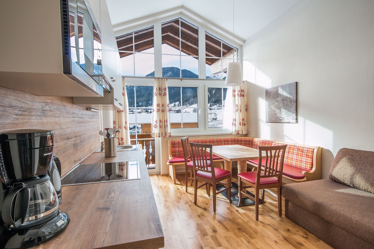 Unsere Apartments vereinen stylischen und gemütlichen Flair mit durchdachter Ausstattung und schaffen so den perfekten Rückzugsort in den Alpen. Die voll ausgestattete Küche mit großzügigen Wohn- und Essbereich bieten dir alles, was du für einen entspannten Aufenthalt brauchst. Familienfreundlichkeit steht bei uns im Mittelpunkt. Highlight: Jedes Apartment verfügt über eine eigene Terrasse mit privater Outdoor Sauna und einem Chill out Bereich für schöne Stunden unter freien Himmel.