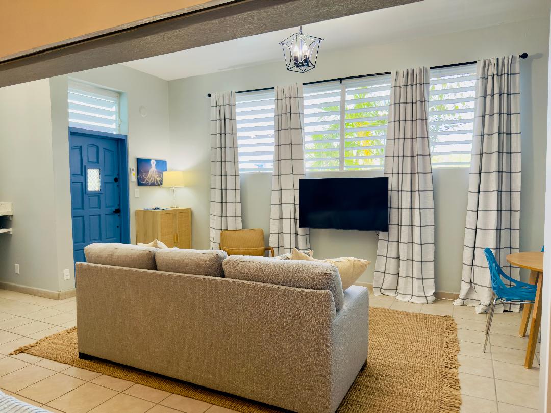 Welcome to THE "COVE" SUITE at The Flamingo House, a newly renovated lower level bedroom apartment just uphill from Cruz Bay. This spacious suite includes a king bedroom, full kitchen, & living room with a queen sleeper sofa. Beaches, hiking trails, the National Park, restaurants, & the ferry are a short walk downhill, with an uphill return. Snorkel & mask sets, beach chairs, cooler, & off-street parking are provided. Ideal for 2 guests, the sleeper sofa allows space for up to 4. Generator power