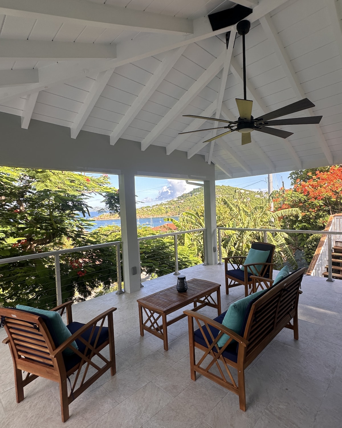 Welcome! Come enjoy a stay in beautiful St. John. Hoos House is a modest 2 bedroom, 1 bath home (Upper level of a Duplex) fully renovated with amazing south facing views. Overlooking Great Cruz Bay and the Westin Resort below and St. Croix in the distance on clear days. Enjoy the covered patio with seating and dining. Amazing breezes and shade all day long. Close to town and parking available. A/C in the bedrooms.