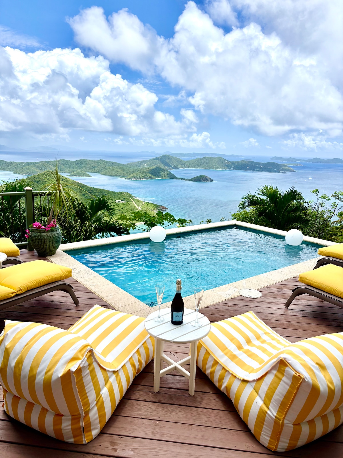 1 of 3 units on property. Discover our pool house studio villa, nestled in the Gifft Hill area of Cruz Bay Quarter, offering stunning ocean and neighboring island views. As a guest of our villa, you have access to a 2020 Jeep Wrangler with booking. Our unique and beautiful design includes a rooftop saltwater swimming pool, which is shared among the three units on the property. Enjoy breathtaking views from every area of the unit, including the pool and entire property.