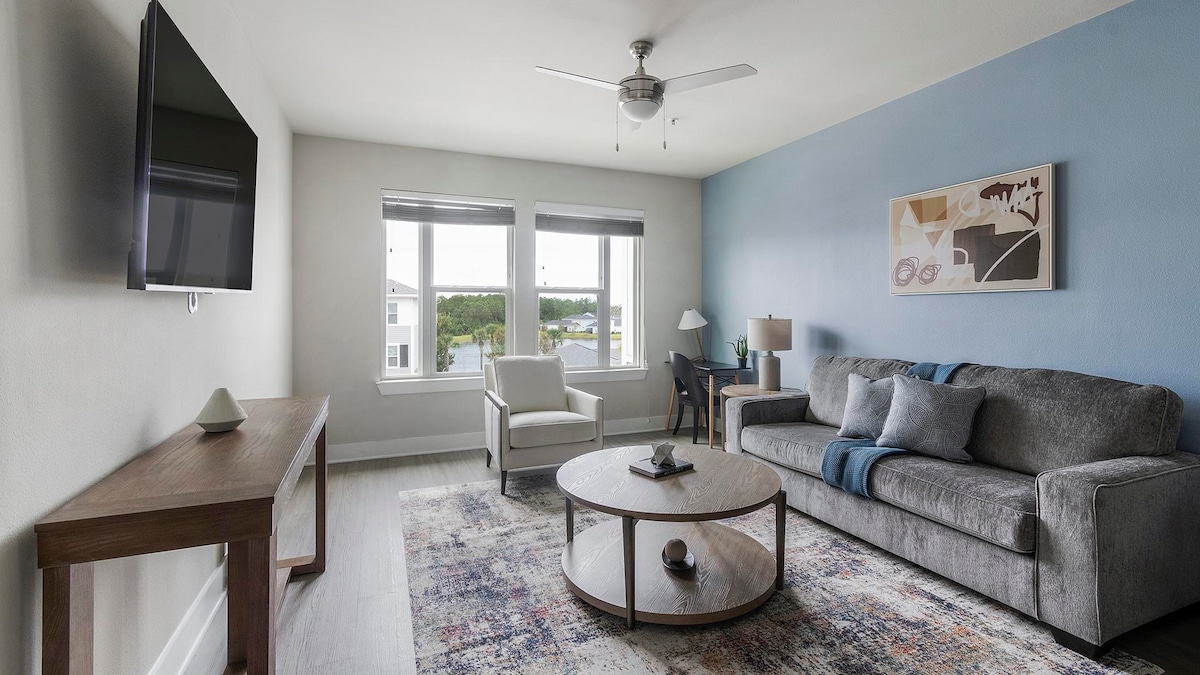 Entire modern, luxurious, and spacious apartment. Stunning lake-front view with gorgeous sunsets. Large king bed and queen sleeper sofa provide a comfortable stay for 4. Whether your stay includes a day of shopping, a trip to golf, going to work, or to unwind at the beautiful Jacksonville beaches, you are never far from your destination. Less than 5 miles to the St. Johns Town Center, 7 miles to the nearest hospital, 11 miles to the beaches, and 6 miles to the nearest golf course.
