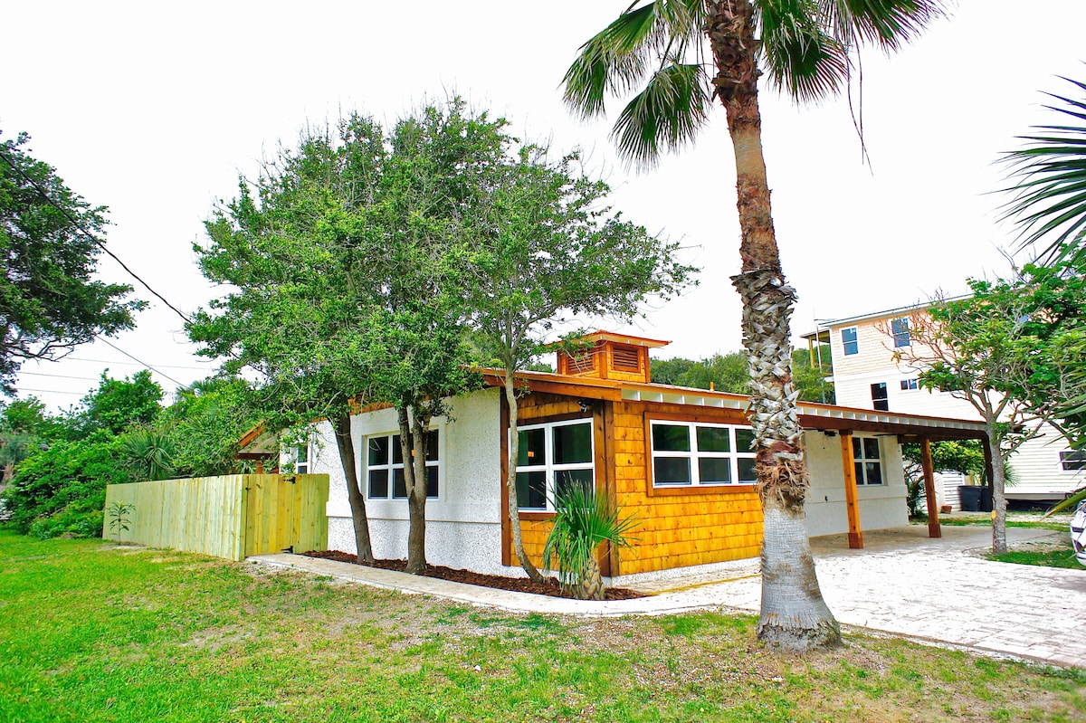 Completely Renovated Beach house, 2 blocks from the Ocean on St. Augustine's most magical beach. Backyard has seasonal Fruit trees, seating area, shower, private Hot Tub, & BBQ. Front has a covered sitting area & 240 volt EVs. charger. Blinds on widows in all bedrooms. Located a couple of blocks to great spots to eat & drink or a short stroll to the Beach. 14 minute drive/28 minute bike ride to the historic downtown landmarks. Bike to Amphitheater. WIFI enabled, 200 mbbs internet speed
