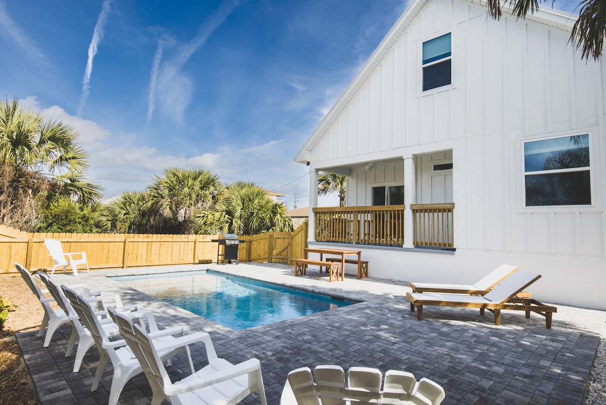 * Built in 2023- luxe coastal furnishings & linens * Featured in 2024 Good Housekeeping Mag🌟 * 2 King Suites (1 on each floor) | 2 Queen Bedrooms | 3.5 Baths * Private Saltwater Pool & Spa/Hot Tub * Poolside Cabana | Outdoor Kitchen | Front Porch * Bikes, Beach Toys, Beach Chairs * Lush Tropical Landscaping * 0.2 miles - gorgeous quiet beach * 5.5 miles- historic downtown St Augustine- The oldest city in the United States! * 0.2 miles - Cap's Restaurant for sunset dinner on the water