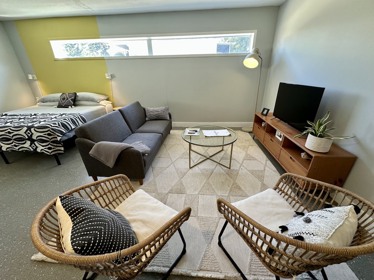 Welcome to the newly renovated Pop's Garage! If you've stayed with us before, you'll love the upgrades to our kitchen, the bathroom and the new floors throughout. Plus, we now feature a new, memory-foam King bed and sleeper sofa to accommodate parties of 4. The pet-friendly space includes a private and secure fenced-in area, allowing your canine to stretch out and explore. Discover the perfect balance of comfort and convenience at this one-of-a-kind vacation rental