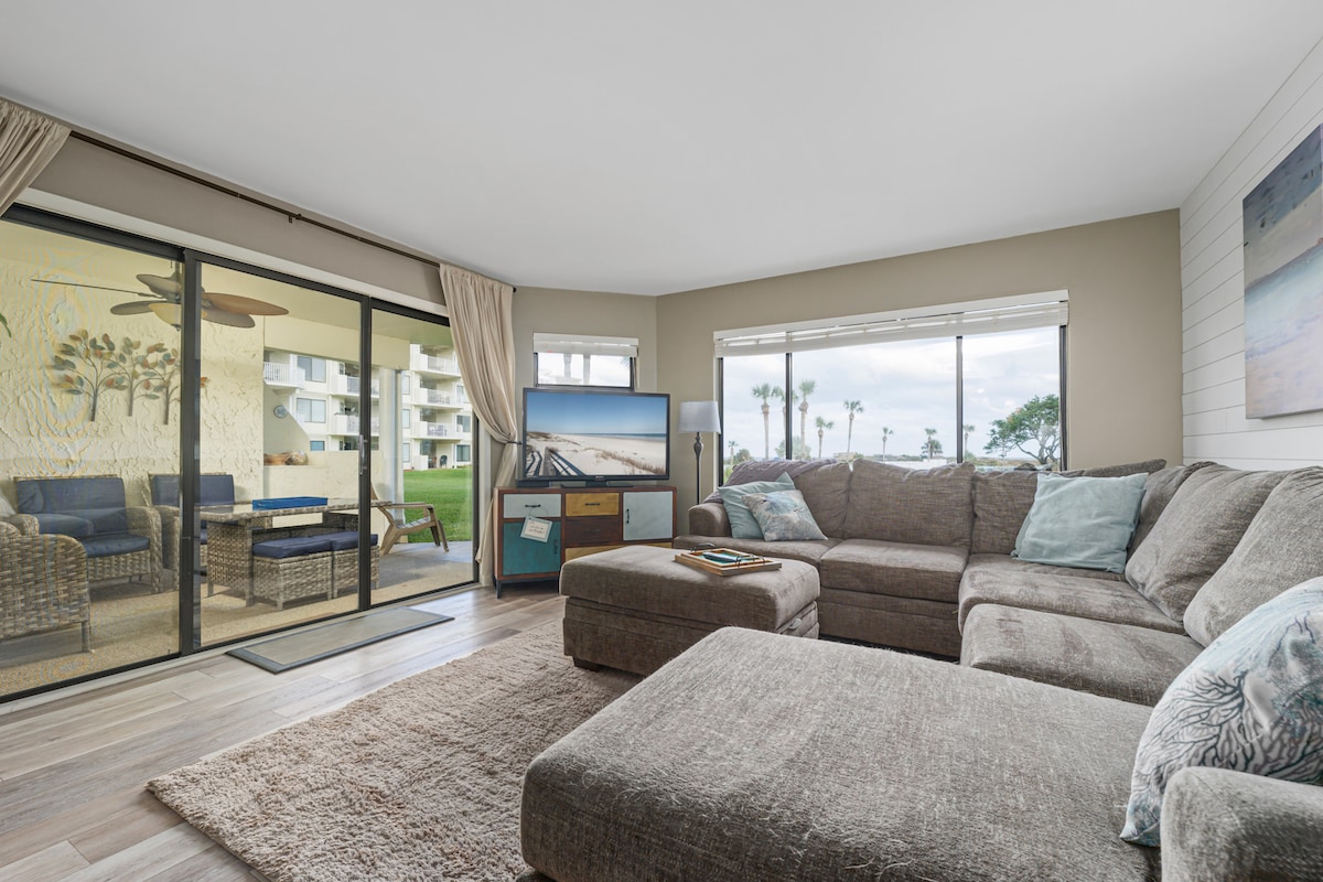 This beautifully updated St. Augustine vacation rental is a two bedroom/two bath condo that comfortably sleeps up to 6. Enjoy your morning coffee and a pool view from the enclosed/screened-in balcony. The kitchen has been updated with new cabinets and granite counters. The living and dining room have ample seating for more than 6 guests. The master bedroom has a king bed & a flat screen TV. The enclosed upstairs bedroom has 1 Queen bed + bunkbeds with twin mattresses + a flat screen TV.