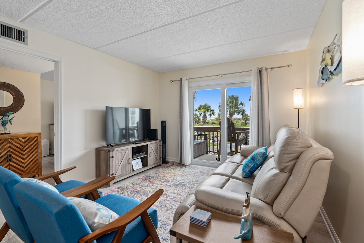 BEST spot to watch the sunrise, (and moonrise) on St Augustine Beach from every room in the condo and from the two direct beach front balconies! CORNER UNIT! TOP FLOOR! One balcony off the upstairs corner primary bedroom suite, walk in closet and ocean view King size beds in each bedroom. Anytime is a good time to be on the beach in St. Augustine! Winter Spring, Summer, or Fall! Besides being steps from the beach there are plenty of local eateries,great food, live music within walking distance.