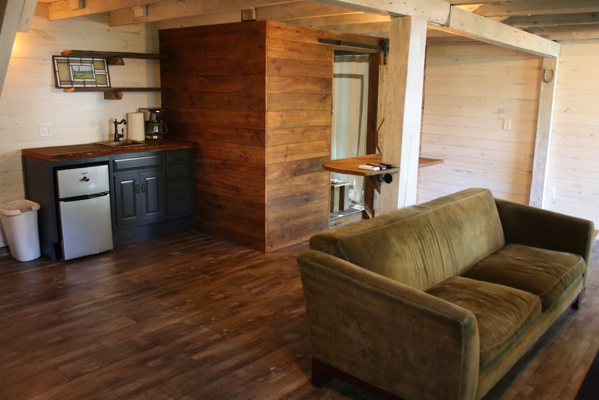 This renovated coach house provides an inexpensive alternative for football weekends. The 700 square-foot loft layout is perfect for a family of four or for two couples who don't want to drive home after a game. Enjoy the rustic charm: whitewashed shiplap walls, reclaimed barn wood, sliding barn door, steampipe fixtures, copper-sink kitchenette and full bath. Also has a mini-fridge, wifi and a large flat-screen TV to watch replays of the game. Newly updated with a mini-split AC/heat unit.