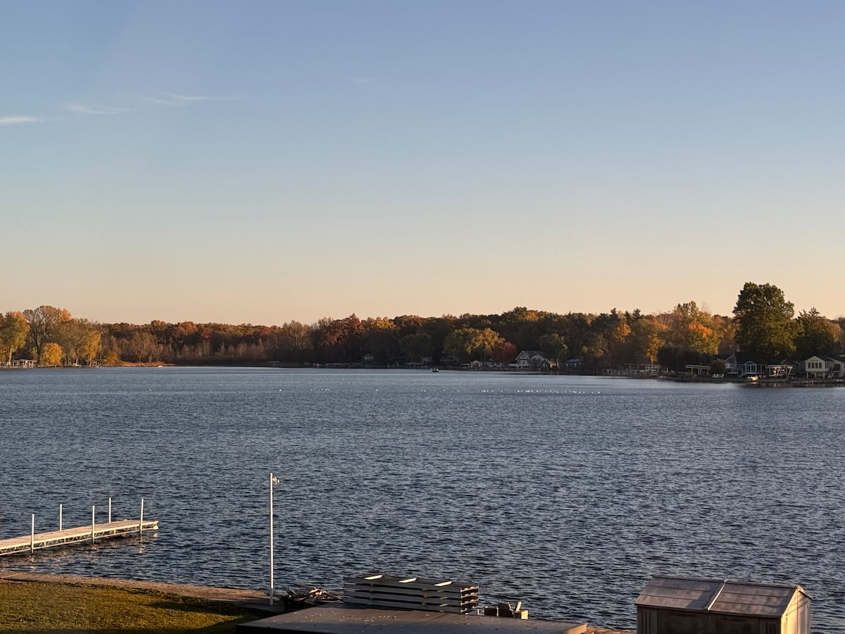 A private and peaceful home on the top of a peninsula with water on three sides! Beautiful setting to accomodate a large gathering of friends and family. Watch the sunrise and the sunset with full sized windows on all sides! Sit by the fire-pit while you fish from the beachfront. Located less than 30 minutes from Kalamazoo and 10 minutes to Three Rivers for all the conveniences and entertainment options. This home has priceless views in the fall, winter, spring and summer! Enjoy!!