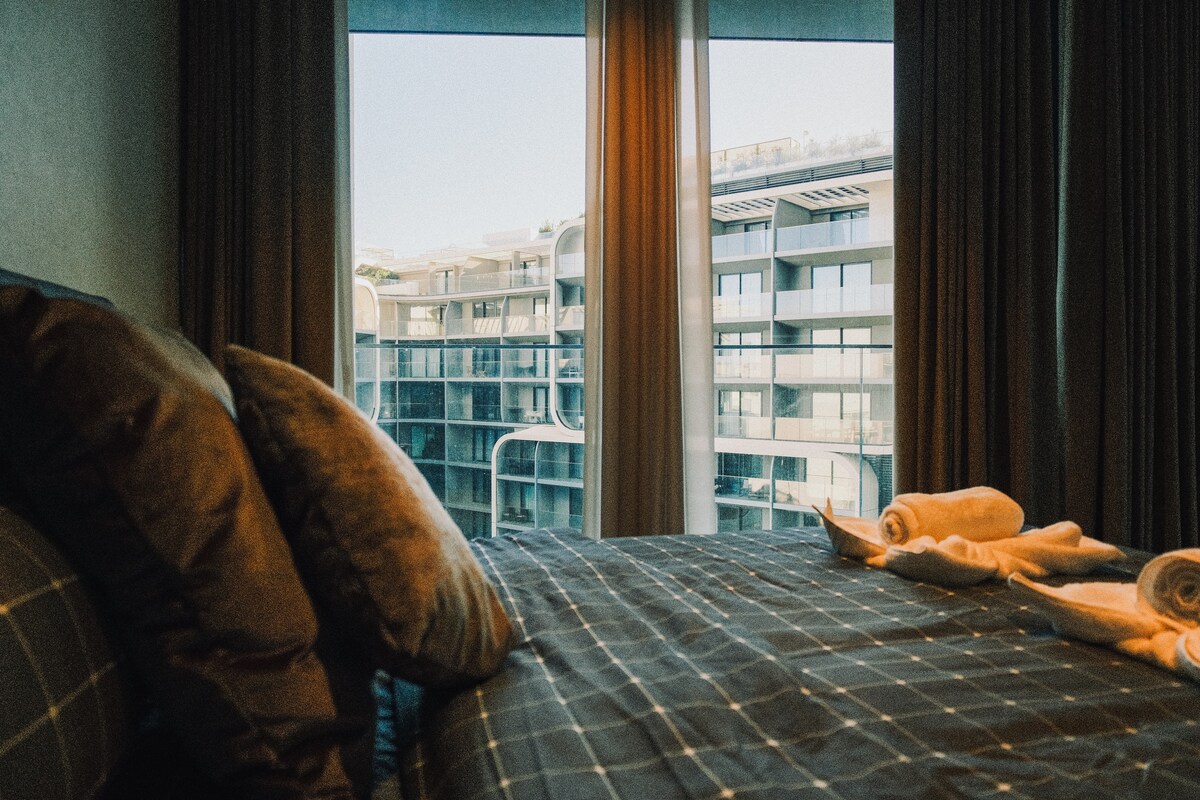Brand-new designer apartment, 25th floor Mercury Towers by Zaha Hadid. Wake up to breathtaking sea and city views from every corner; including bath, sofa, dining table, or balcony. Relax in a stylish, modern kitchen with fine wine glasses and coffee machine, black marble walls, smart TV with Netflix, and outdoor lounge seating. Enjoy free access to rooftop and tower pools, gym, and spa; simply perfect for work, long stays, or a luxurious getaway. I’d love to host you!