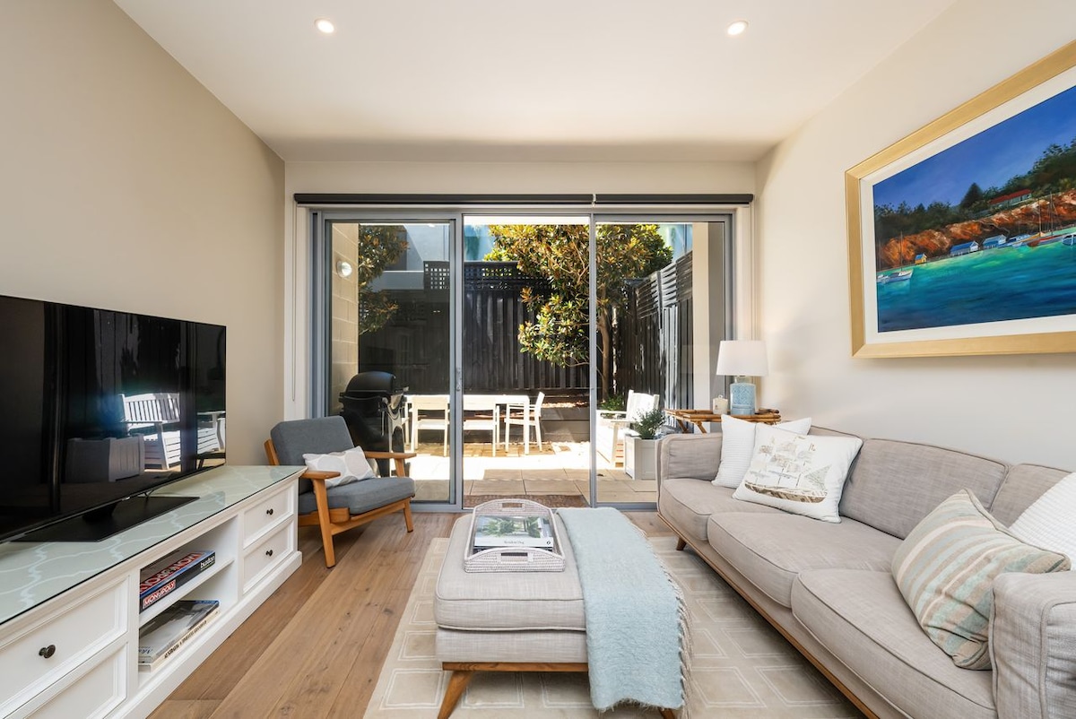**Rare Vacancy between 22nd - 30th Nov - and 8th -15th Dec! BEACH, WATER VIEWS & Netflix - with a spa bath to soak in! This apartment has aircon for summer & a cosy fire for winter. Queen bed in master & 2 singles/king bed in 2nd bedroom, with luxury linen. My place is not new but full of character & charm in white & blue mediterranean tones. It's your perfect beach spot with a balcony & walking distance to many great restaurants. As a super-host, I welcome you!