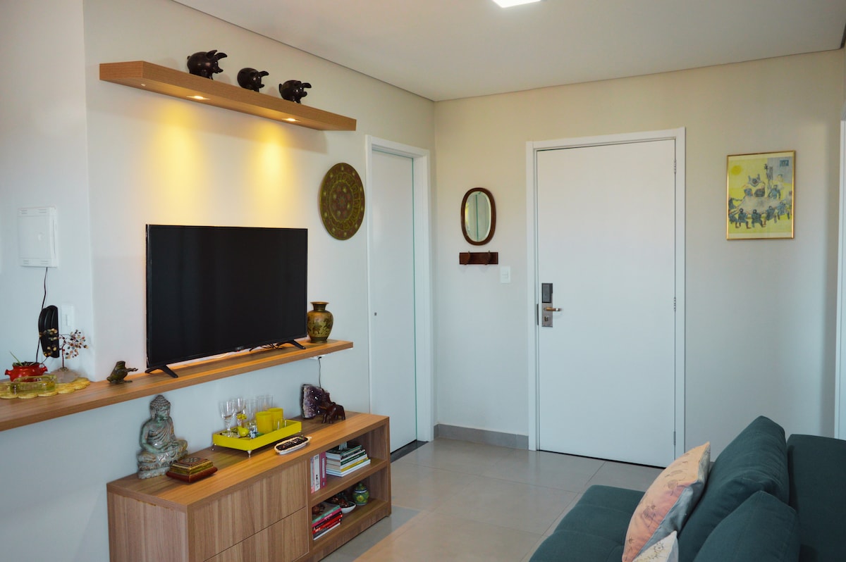 Flat aconchegante e moderno no coração de São Lourenço, próximo ao Parque das Águas, restaurantes e comércio! O apartamento possui uma cama de casal e um confortável sofá cama acomodando até 4 hóspedes. Equipado com 2 aparelhos de TV, uma cozinha completa com airfryer, microondas, cooktop por indução, toalhas e roupa de cama. O condomínio possui excelente infraestrutura com recepção 24h garantindo uma estadia segura e agradável em nossa tão amada cidade!