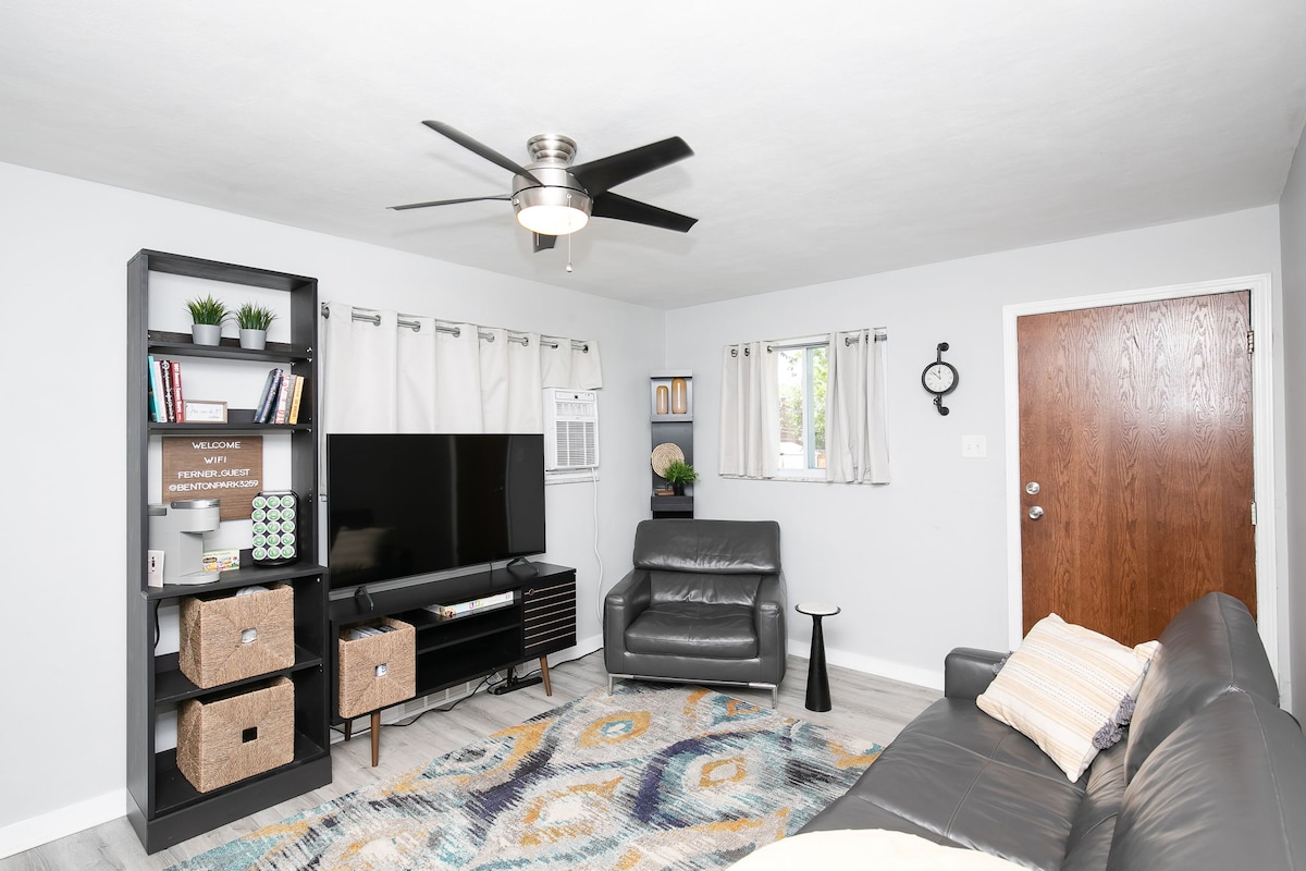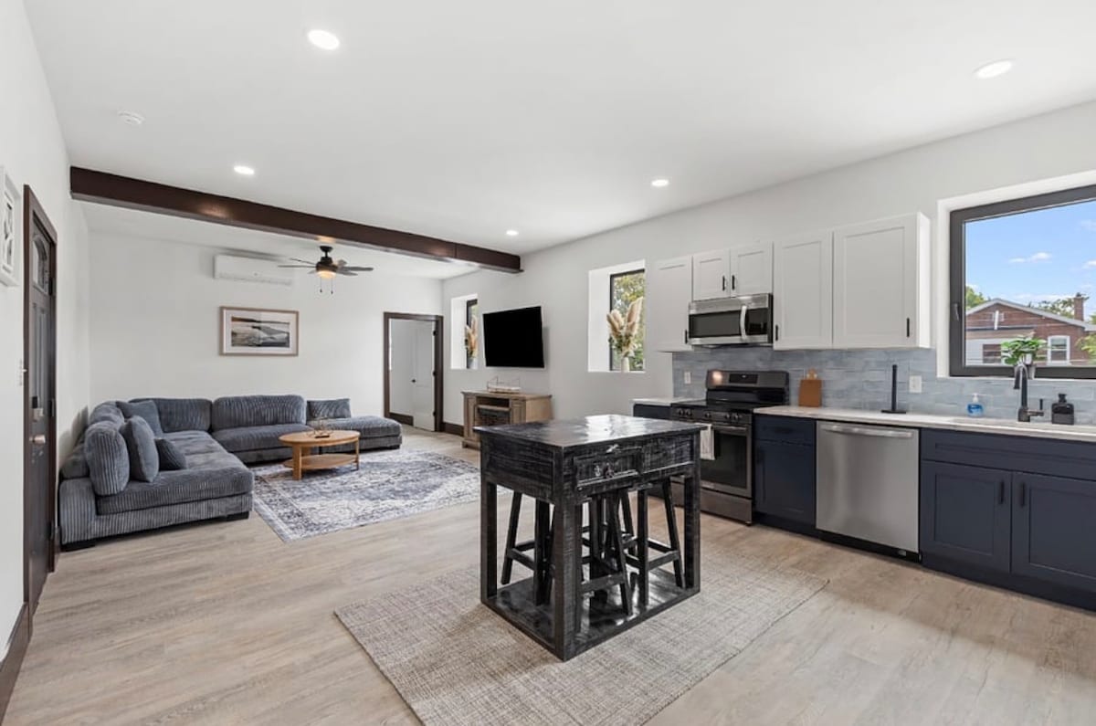 Newly-rehabbed & cozy guest house. Everything you need is located here in the historic Bevo Mill neighborhood. In the heart of south St. Louis city, you’re steps away from local businesses, including the picturesque, historical Das Bevo. Step into a vintage-styled oasis, featuring large windows with plenty of natural light, tall vaulted ceilings, comfy queen bed, unique fridge, breakfast bar, sizable bathroom with a large walk-in shower. Hang outside at the picnic table under cute string lights.