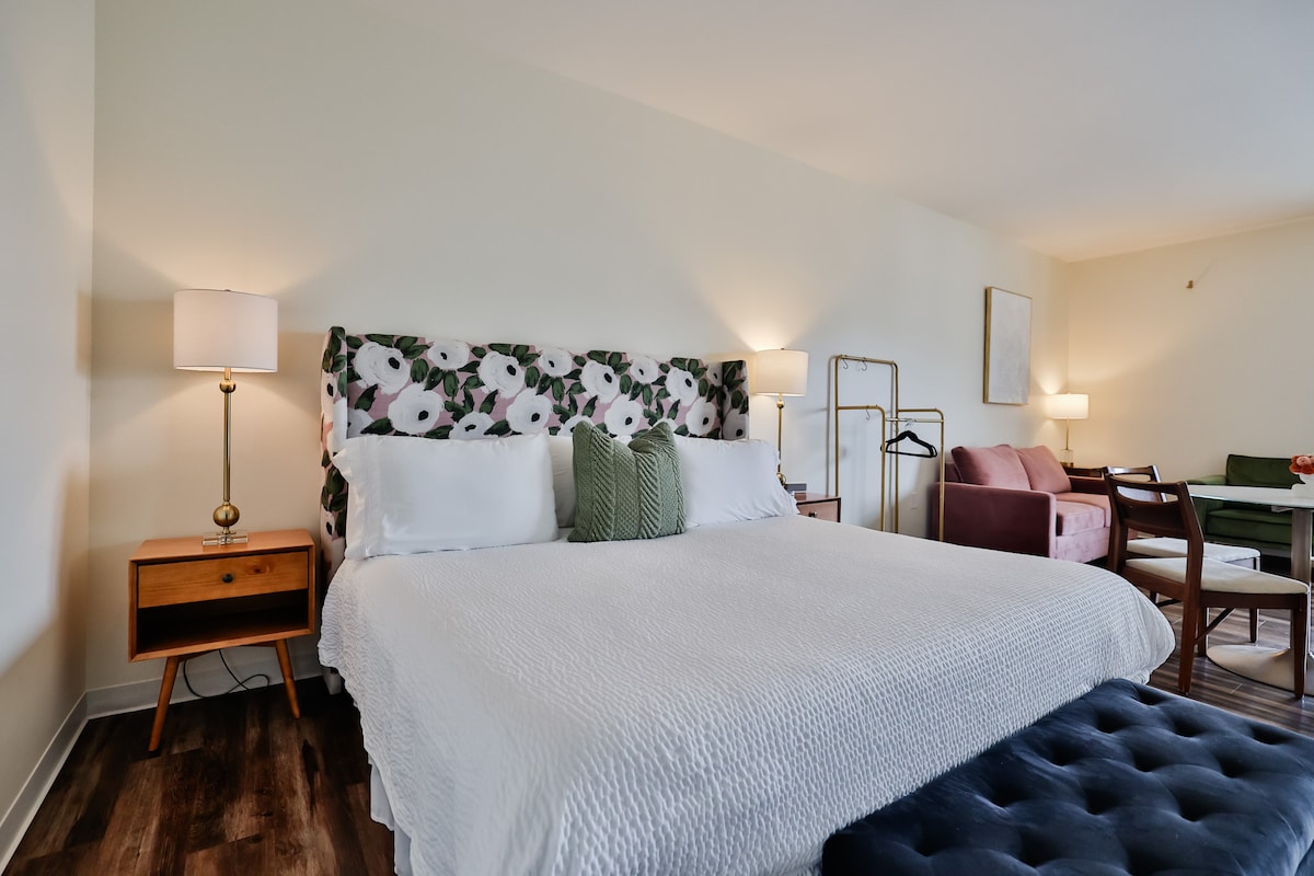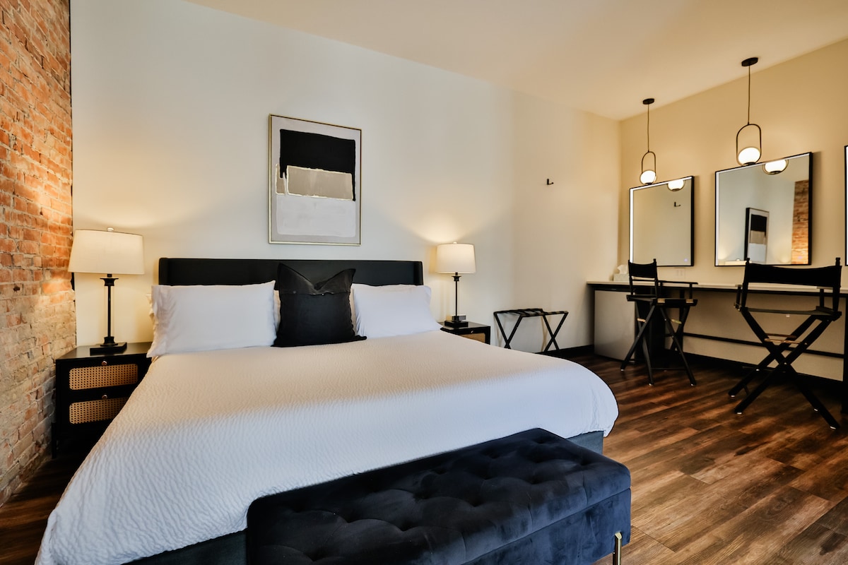 The Nash Loft is a stunning minimalist studio with 12’ ceilings, a fully-equipped kitchen with black stainless appliances and quartz countertops, stackable washer + dryer, a designer bathroom with black stainless fixtures and frameless glass shower, a comfortable workspace with high-speed internet connection, bwalk-in closet, and a lovely patio overlooking the courtyard. Situated along the famous Locust Street in the heart of Midtown, you’ll be steps from SLU, Wells Fargo, BJC, and the Grove.