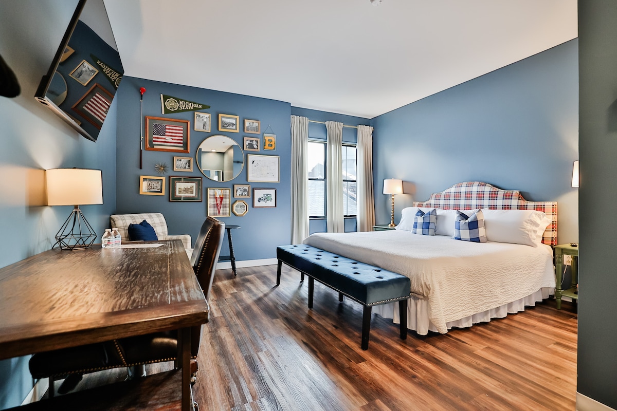 A Lovely room in a historical St. Louis home! The Blue Spruce Room is on the 2nd floor, and has a recently renovated and beautiful bathroom complete with a walk-in rain shower right next to it. The room has a desk, chair, lamp, table, Amazon Fire TV with basically every major streaming App, newly installed hardwood floors, and a Queen sized-bed. The room has two large windows for plenty of natural light with heavy blinds for sleeping in! Full use of the kitchen upstairs is available!